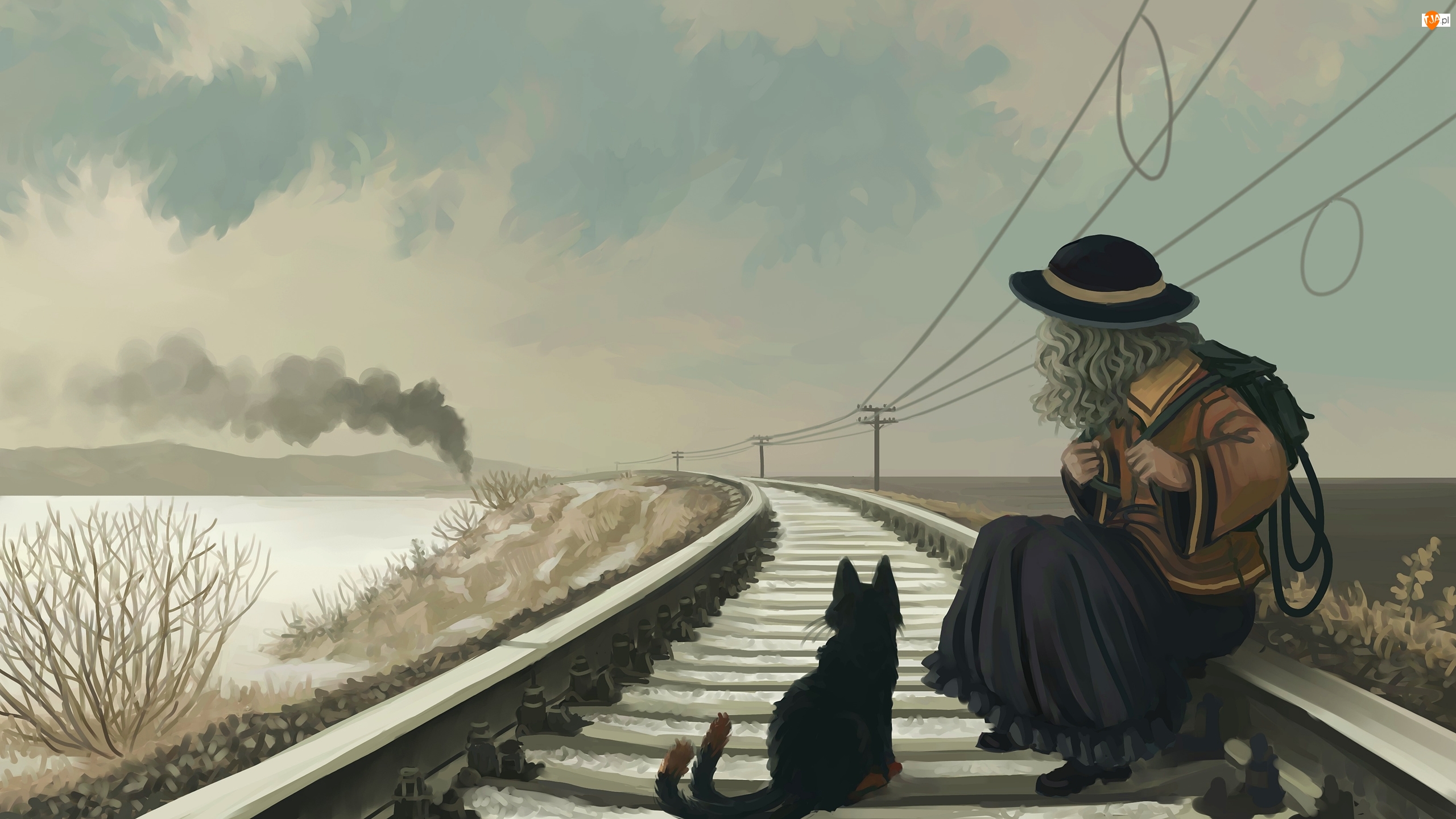 Kot, Rysunek, Dziewczynka, Tory, Pociąg