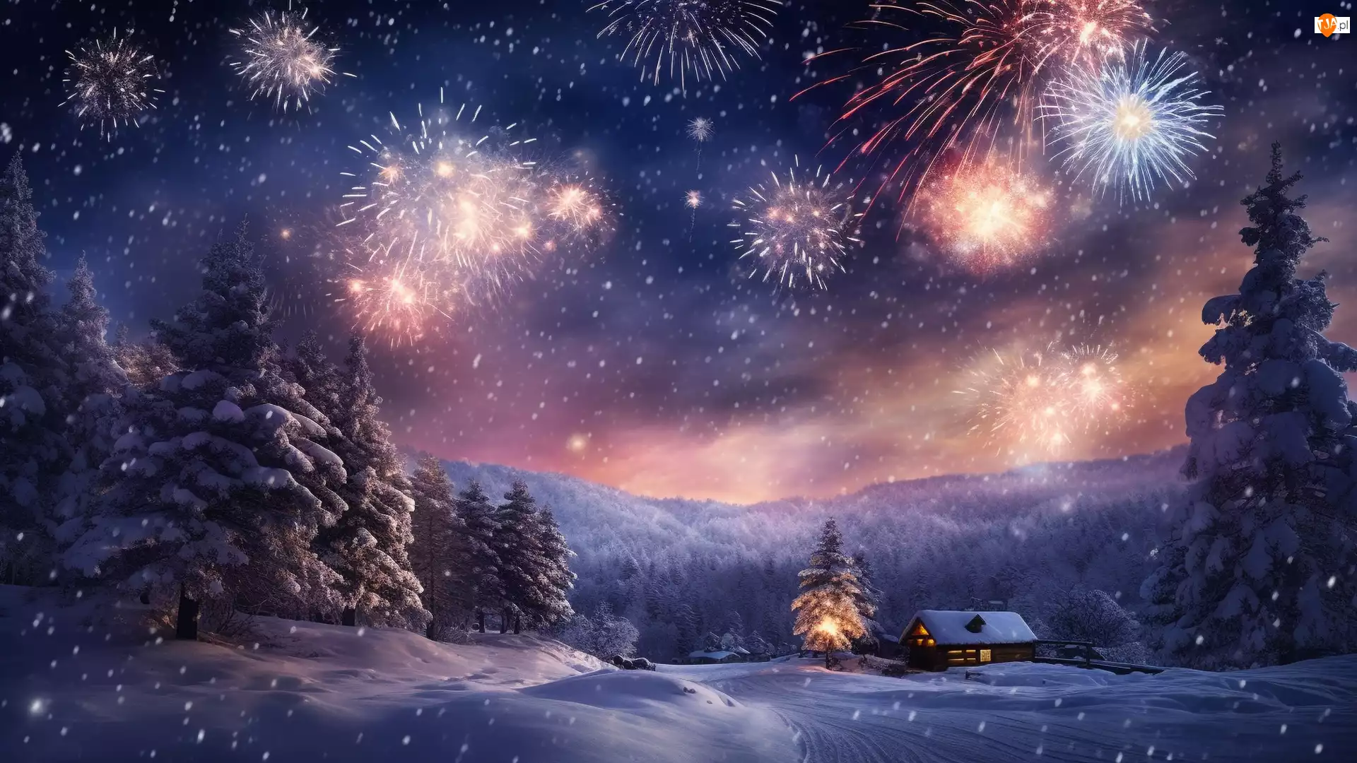 Góry, Dom, Noc, Zima, Drzewa, Śnieg, Fajerwerki