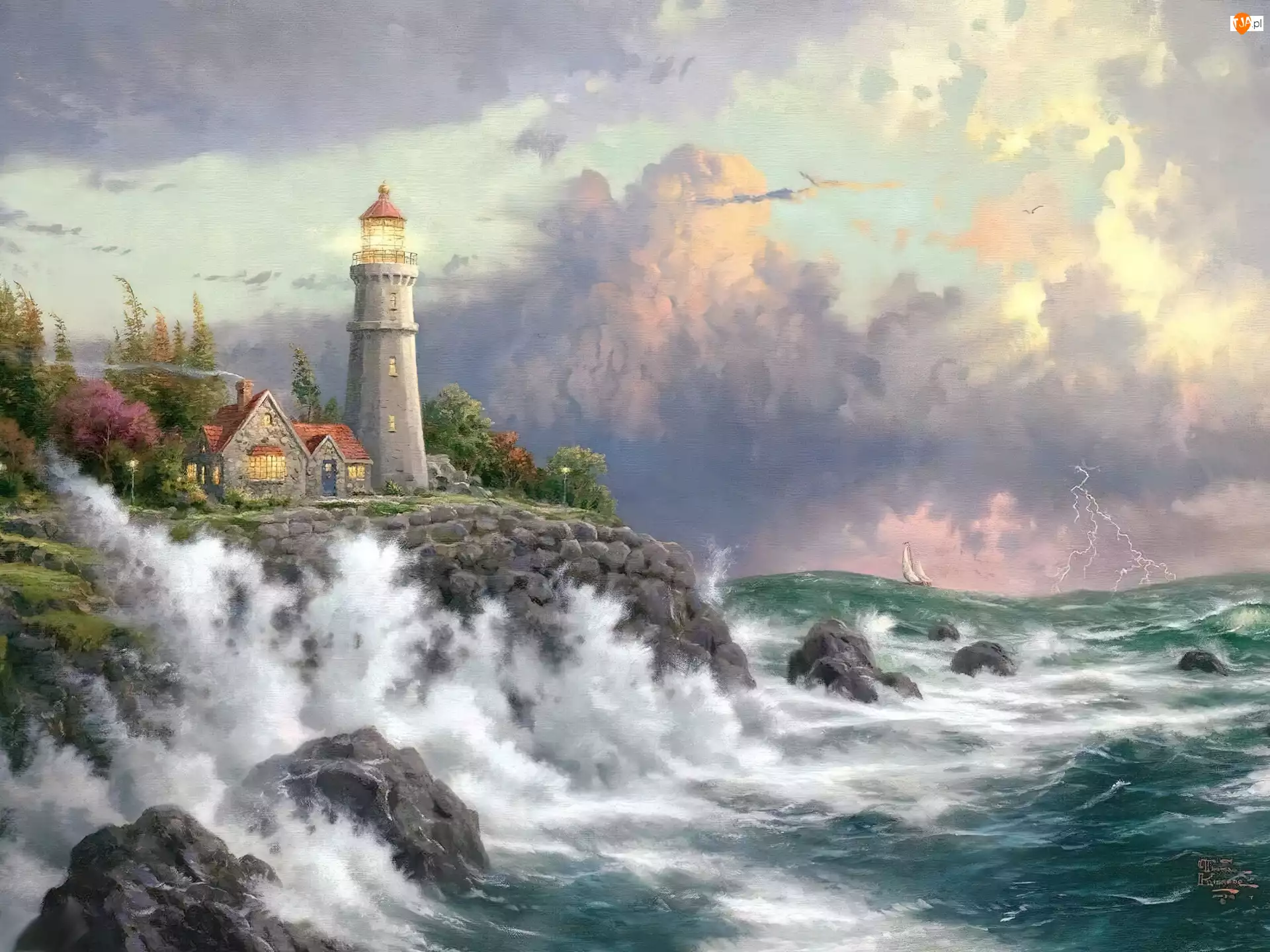 Fale, Morska, Niebo, Morze, Thomas Kinkade, Latarn