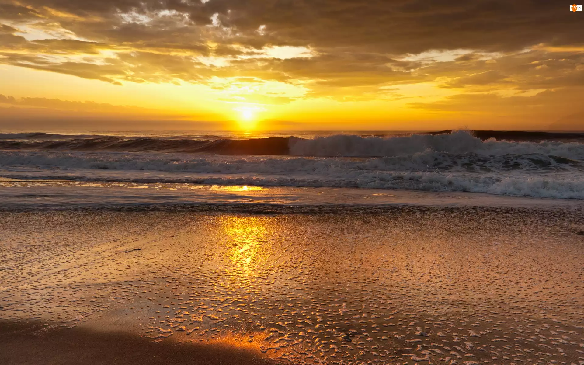 Fale, Zachód, Plaża, Słońca, Morze, Chmury