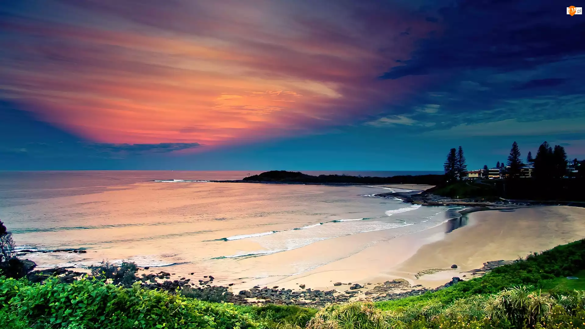 Fale, Zachód, Wybrzeże, Słońca, Piasek, Drzewa