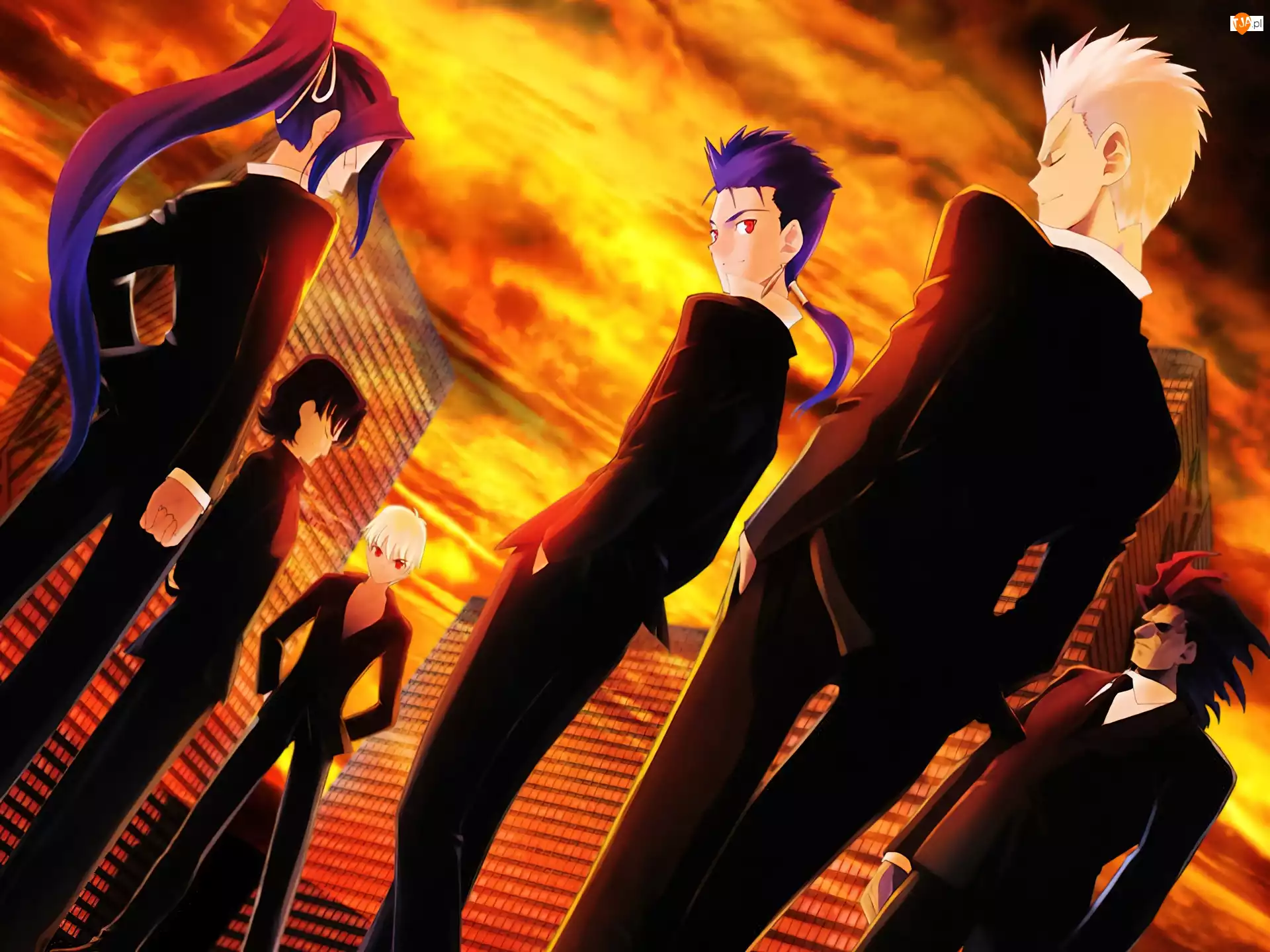 Fate Stay Night, garnitury, wieżowce, ludzie