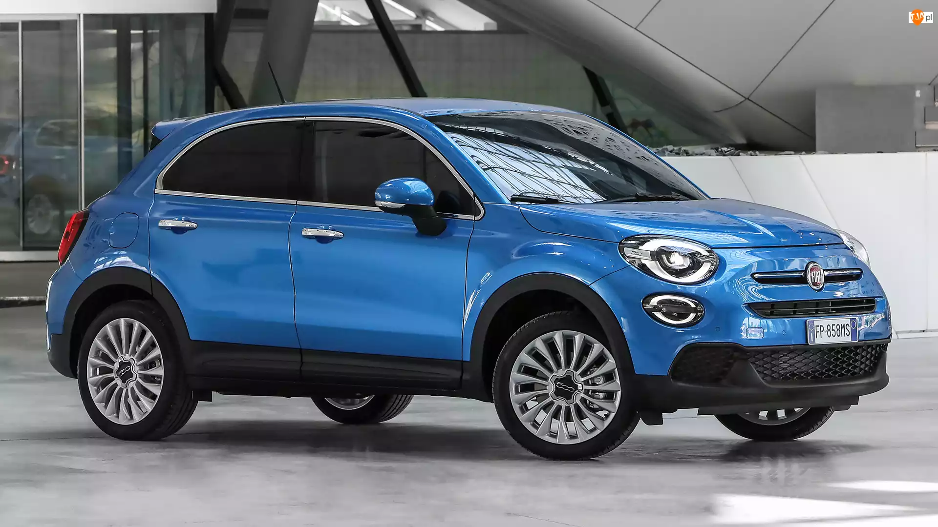 Fiat 500x niebieski stoi pod zadaszeniem