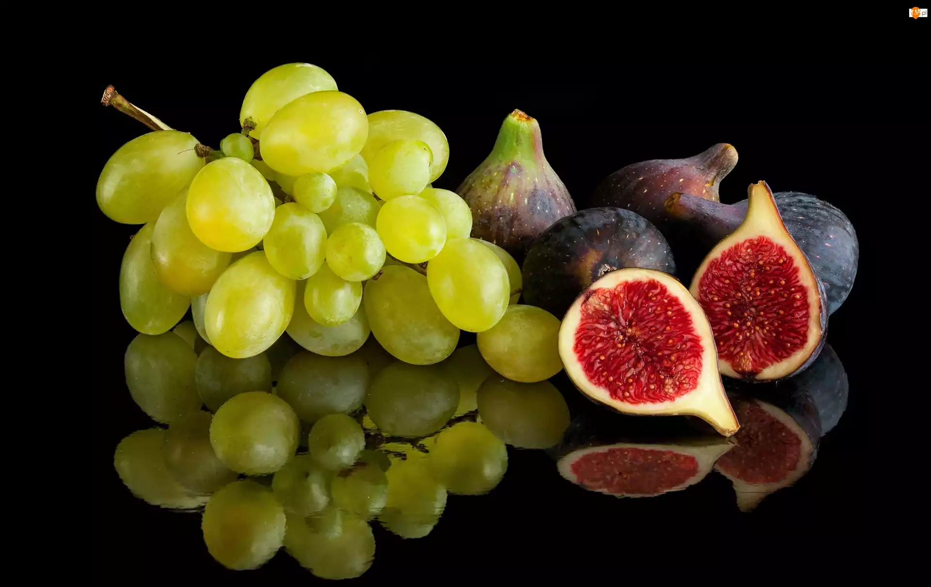 Figi i winogrona w odbiciu na czarnym tle