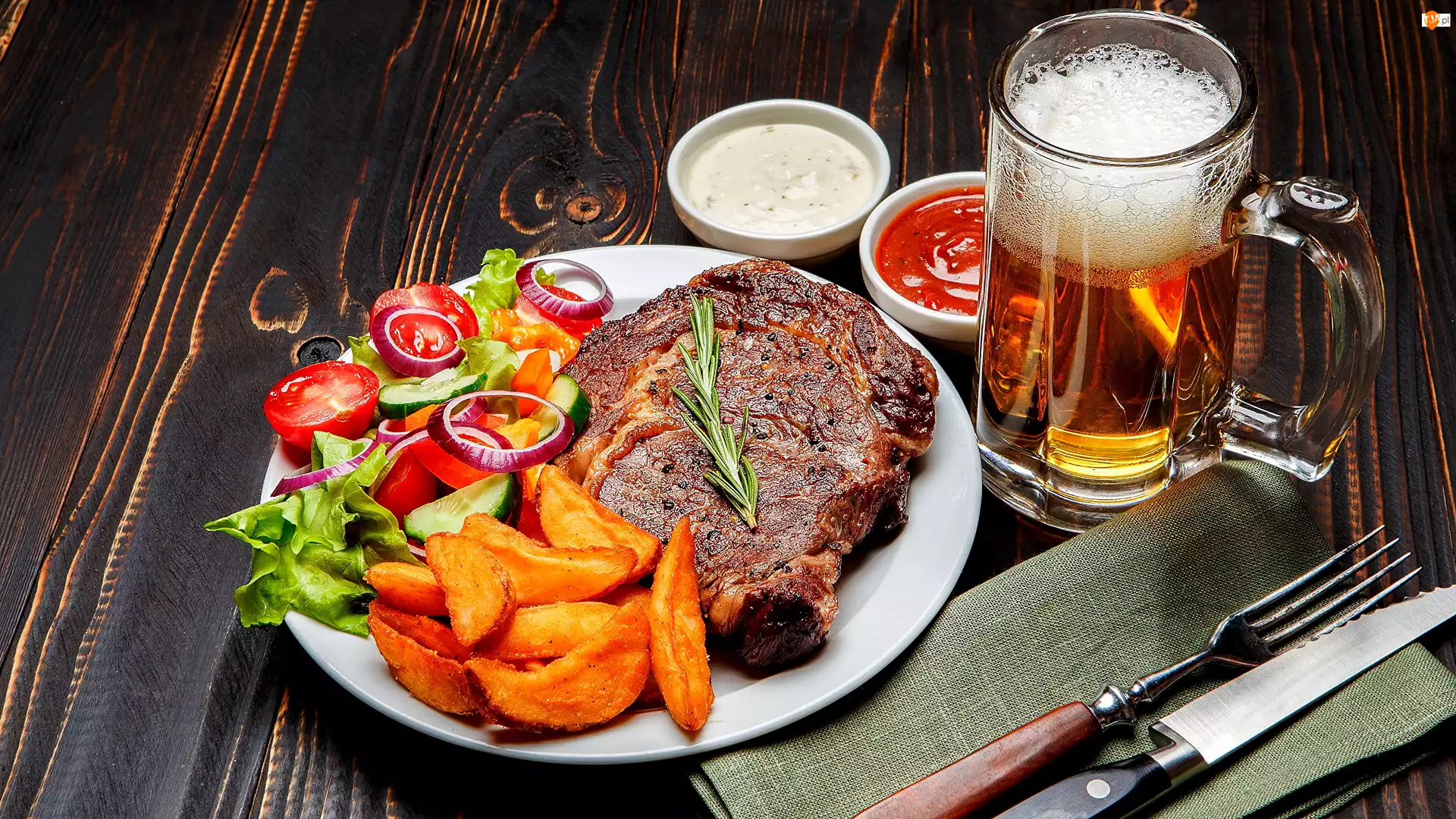Frytki, Piwo, Mięso, Obiad, Sałatka