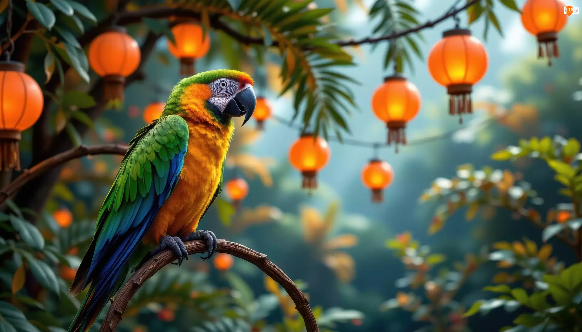 Gałąź, Grafika AI, Ara, Papuga, Lampiony