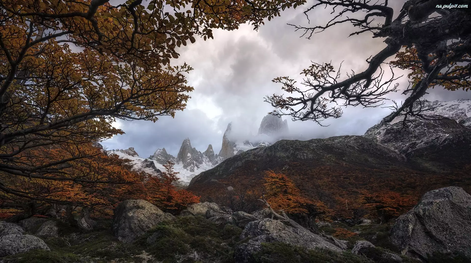 Kamienie, Jesień, Drzewa, Patagonia, Góry Andy, Gałęzie, Argentyna, Park Narodowy Los Glaciares