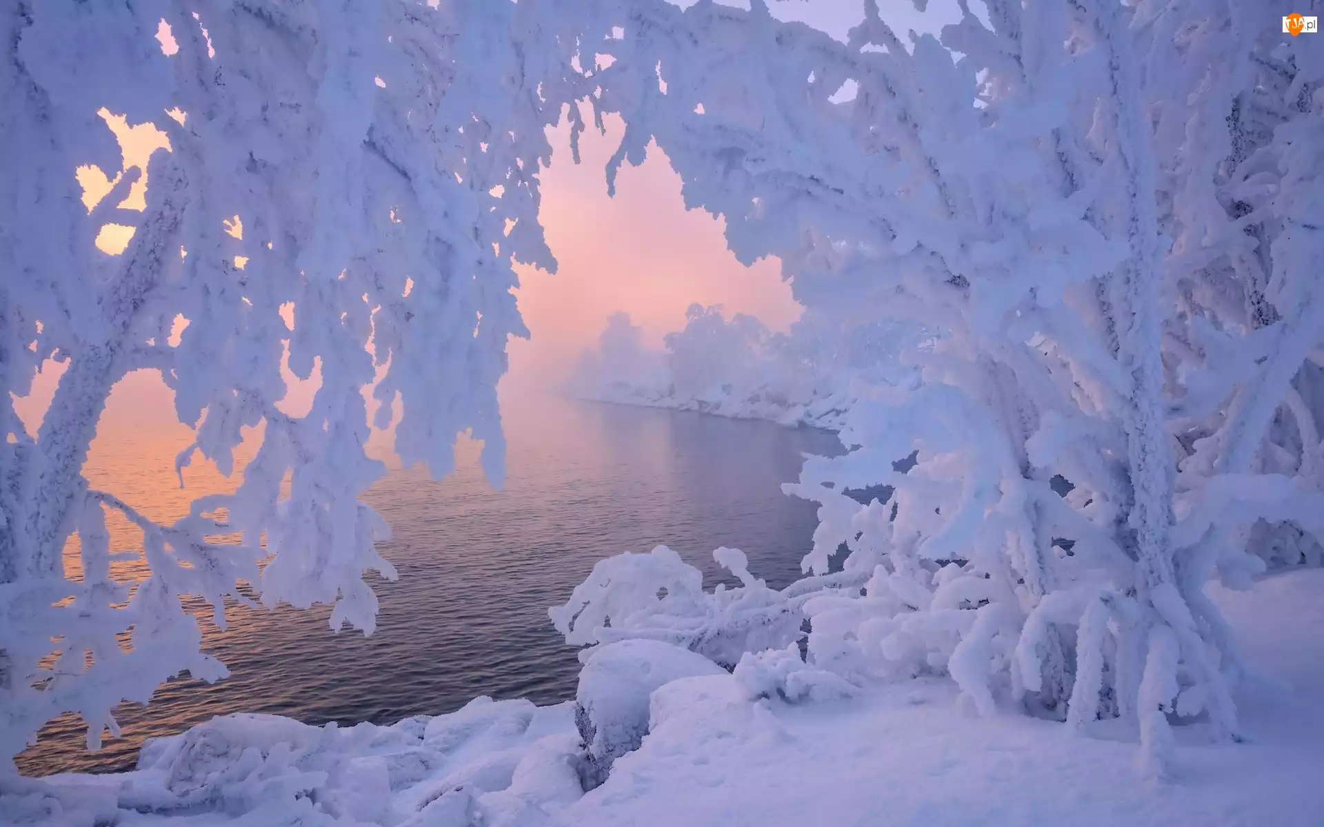 Gałęzie, Jezioro, Drzewa, Zima, Ośnieżone
