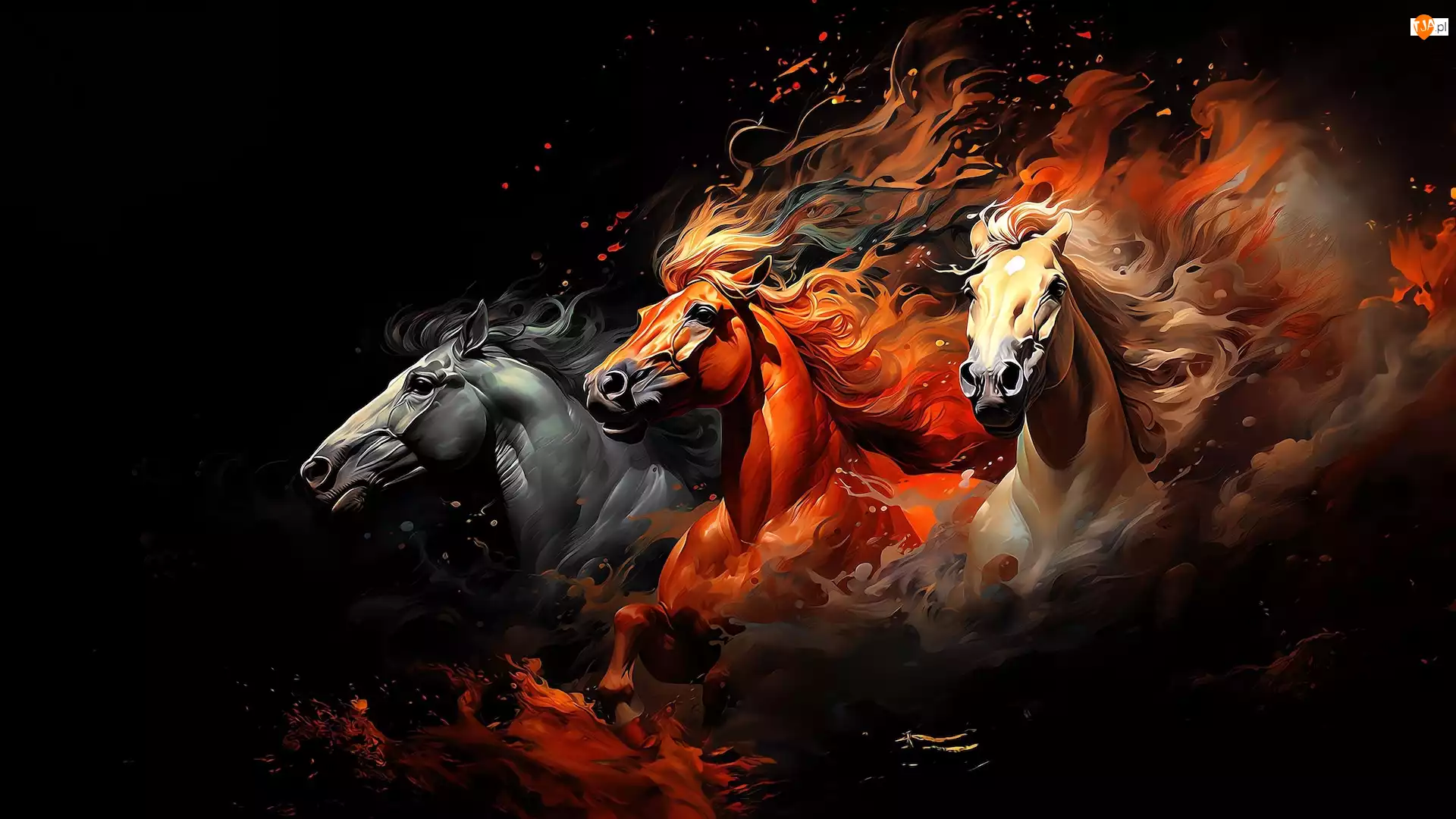 Galop trzech koni na czarnym tle