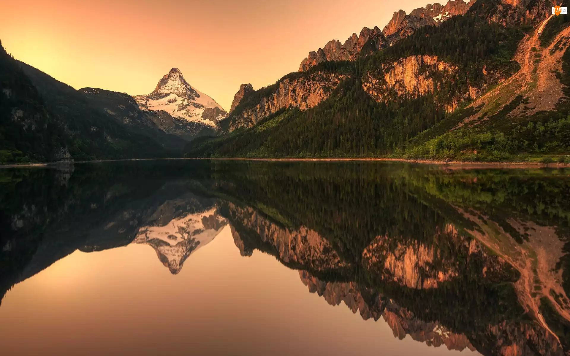 Góry, Dachstein, Odbicie, Austria, Drzewa, Gosaus