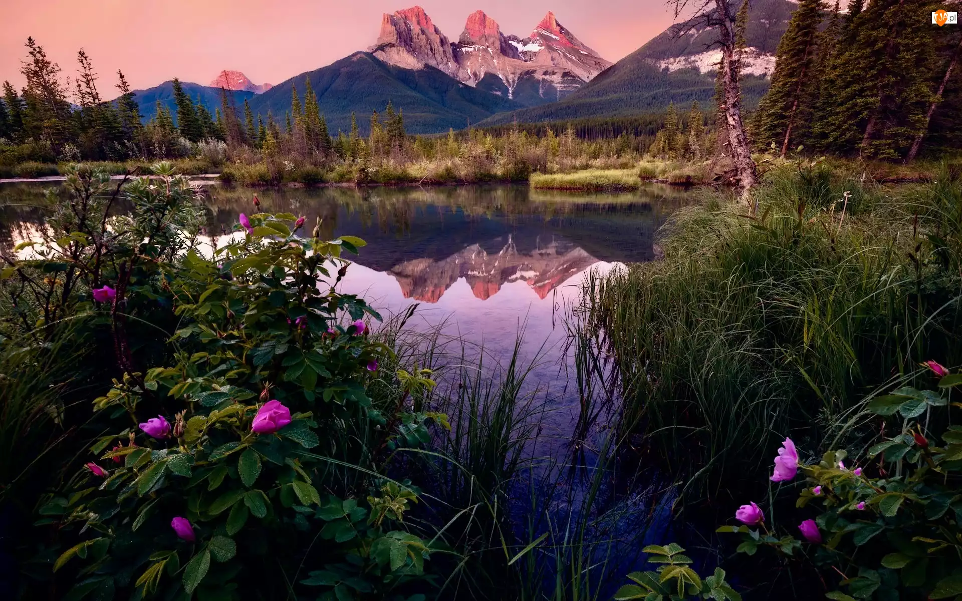 Kwiaty, Alberta, Drzewa, Bow River, Canmore, Góry, Three Sisters Peaks, Kanada, Rzeka