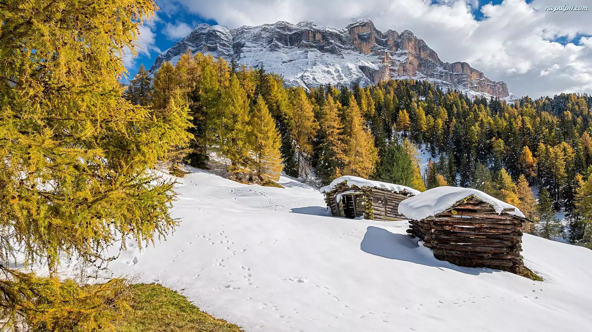 Góry, Zima, Szopy, Chmury, Drewniane, Drzewa