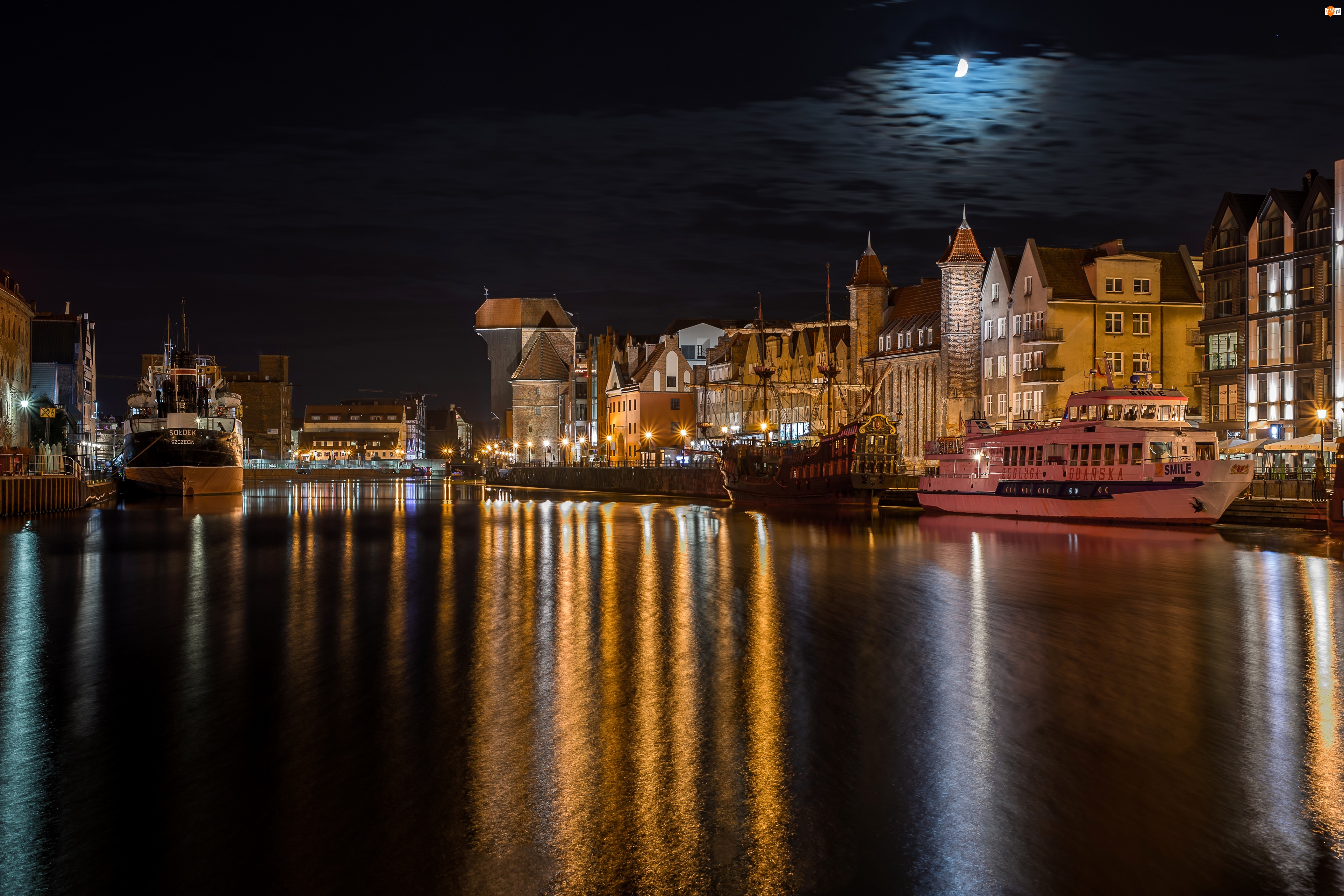 Statki, Polska, Miasto nocą, Gdańsk, Rzeka