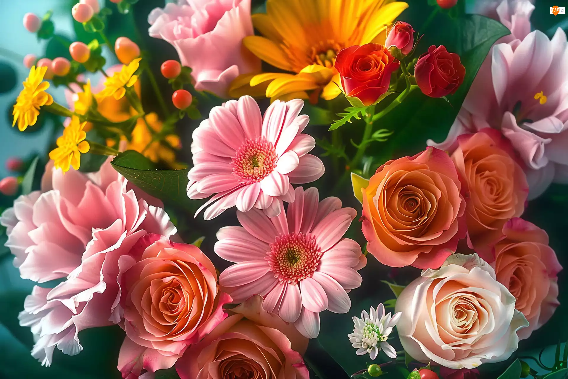 Gerbery, Bukiet, Kwiaty, Kolorowe, Róże