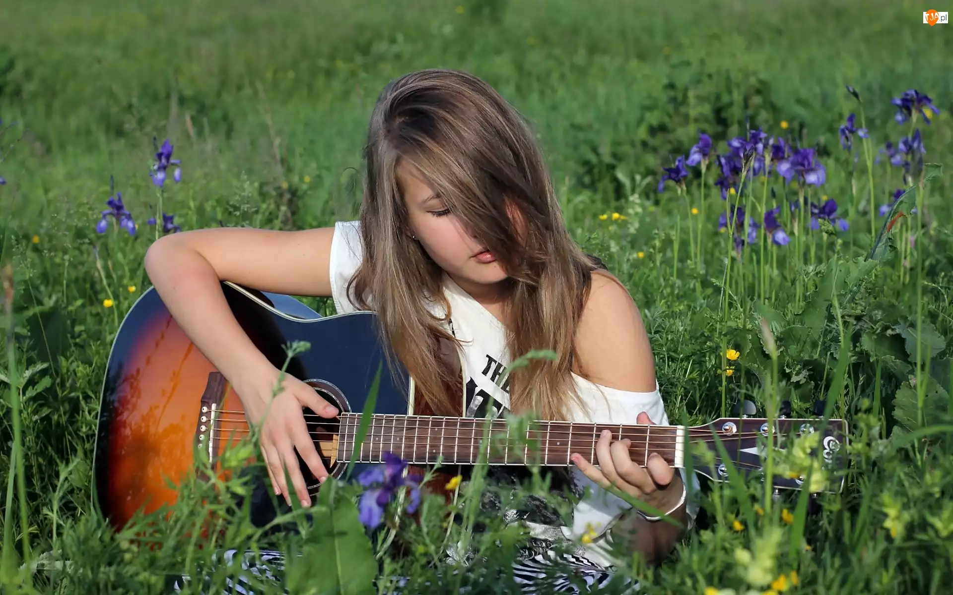 Gitara, Łąka, Kwiaty, Trawa, Dziewczyna