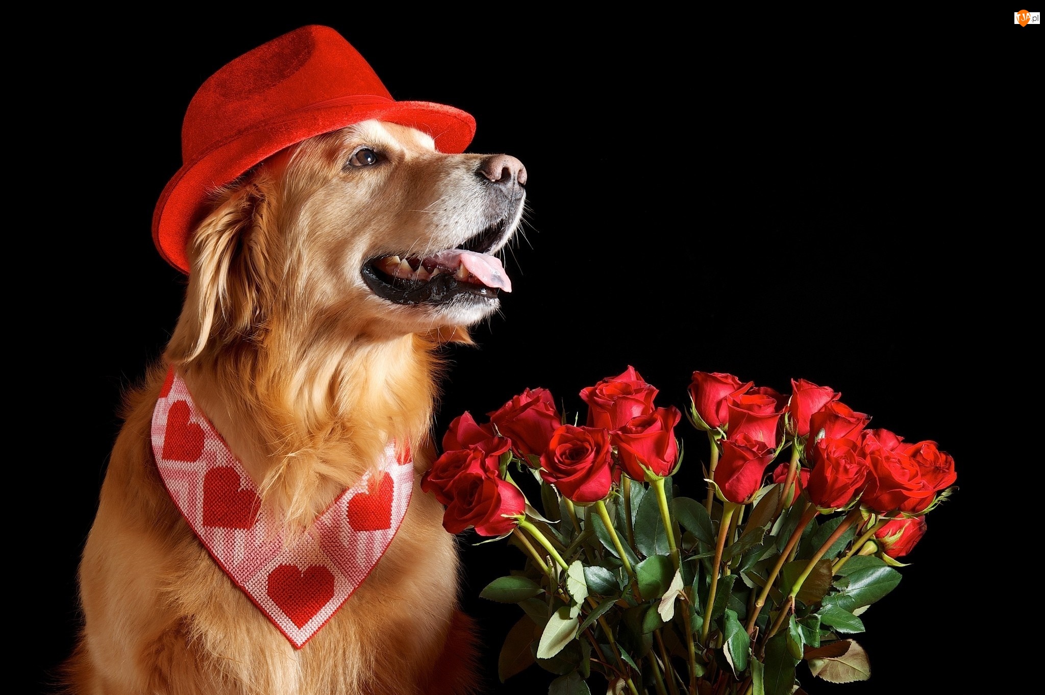 Golden Retriever, Piesek, Róże, Czerwone, Walent