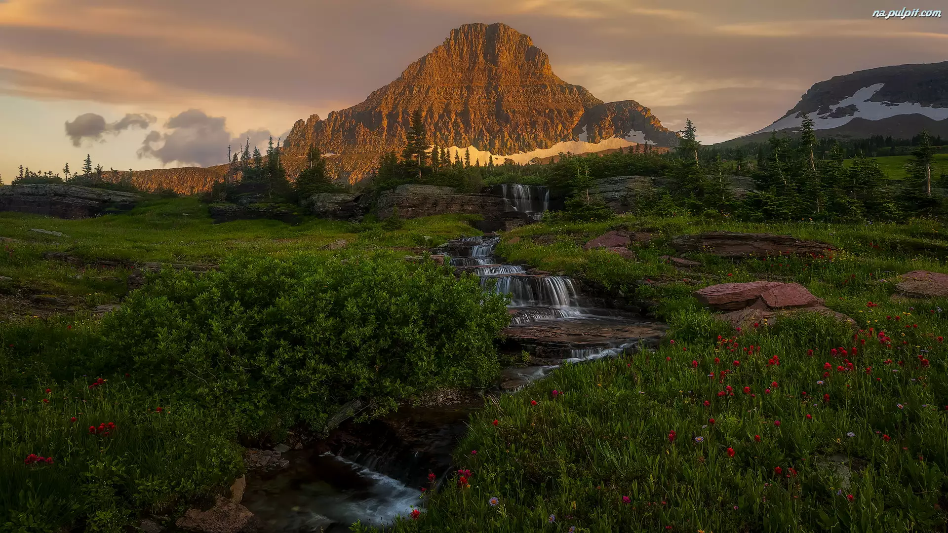 Stany Zjednoczone, Góry Skaliste, Montana, Strumień, Skały, Góra, Reynolds Mountain, Park Narodowy Glacier, Łąka
