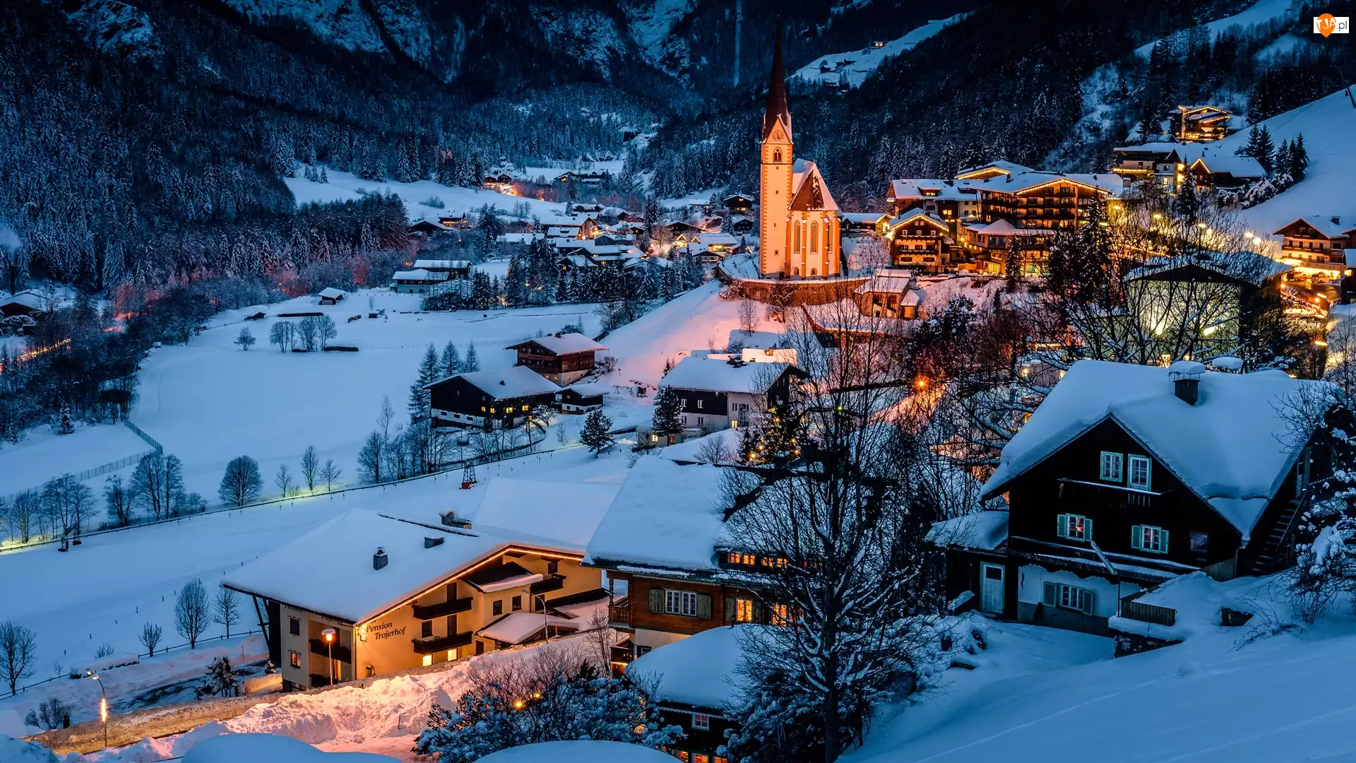 Wysokie Taury, Kościół, Gmina Heiligenblut am Grobglockner, Światła, Dolina, Karyntia, Domy, Zima, Park Narodowy Wysokich Taurów, Góry, Austria