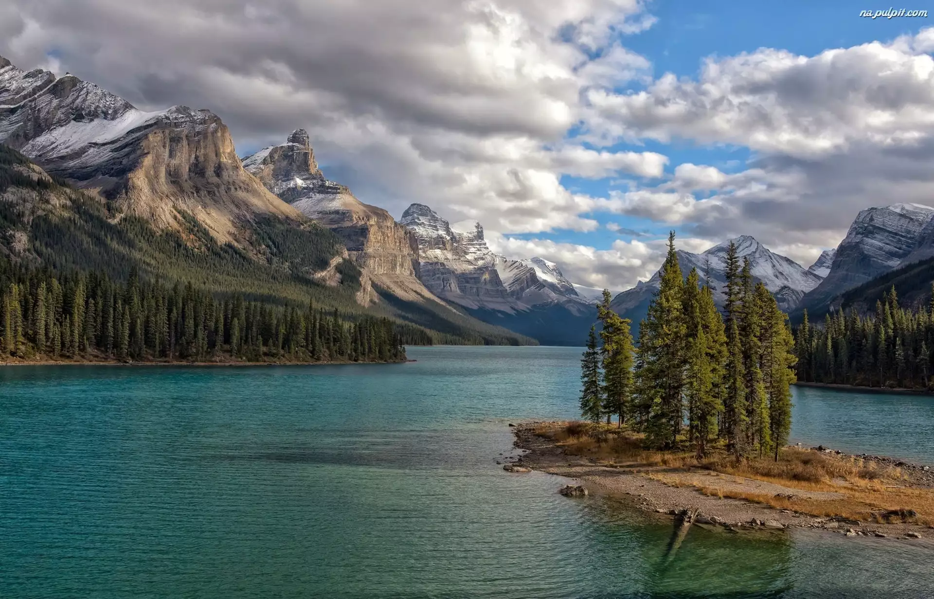 Park Narodowy Jasper, Góry, Drzewa Drzewo, Kanada, Chmury, Wyspa Ducha, Jezioro Maligne