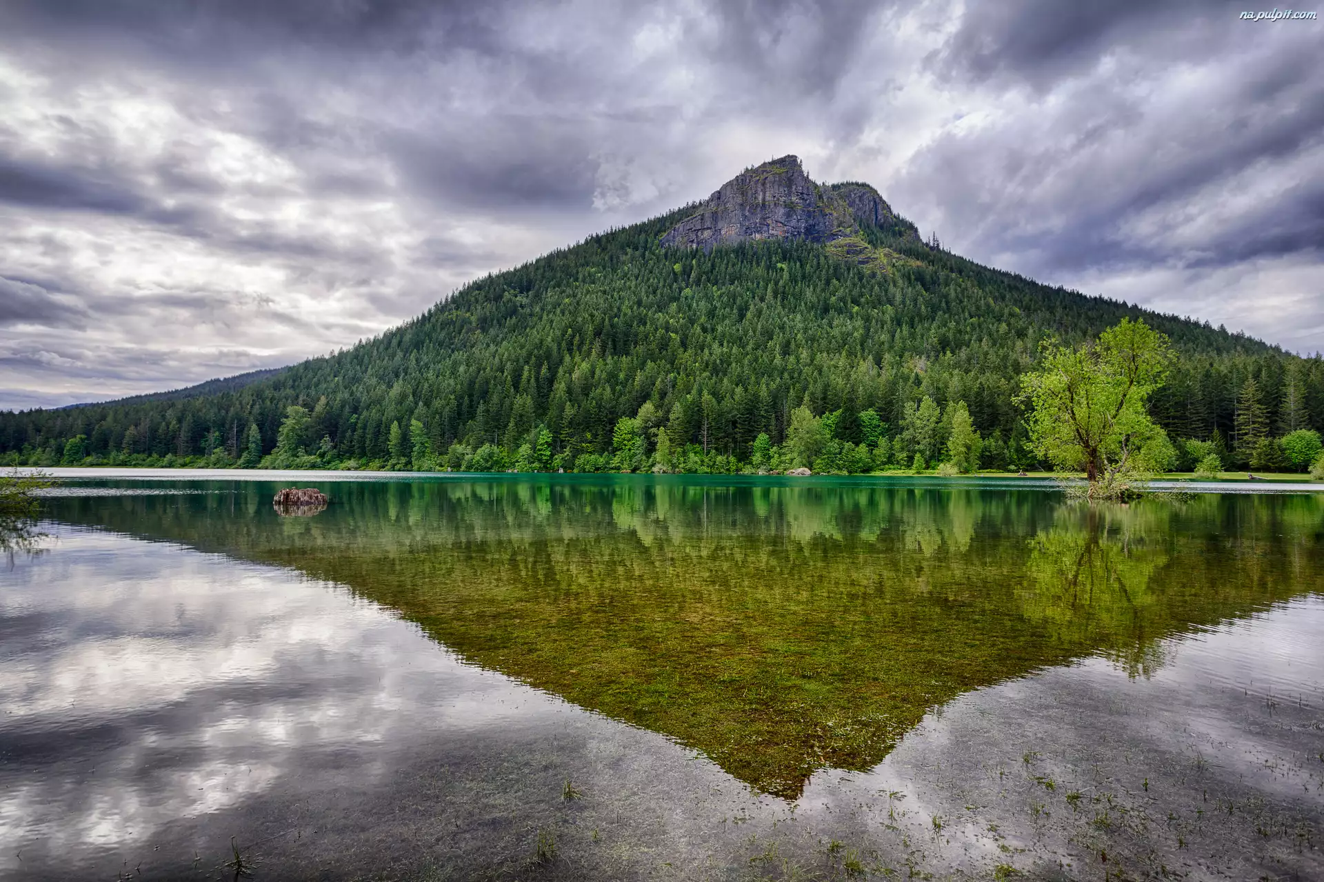 Odbicie, Góra Rattlesnake Ridge, Las, Stan Waszyngton, Jezioro Rattlesnake Lake, Chmury, Stany Zjednoczone, Drzewa