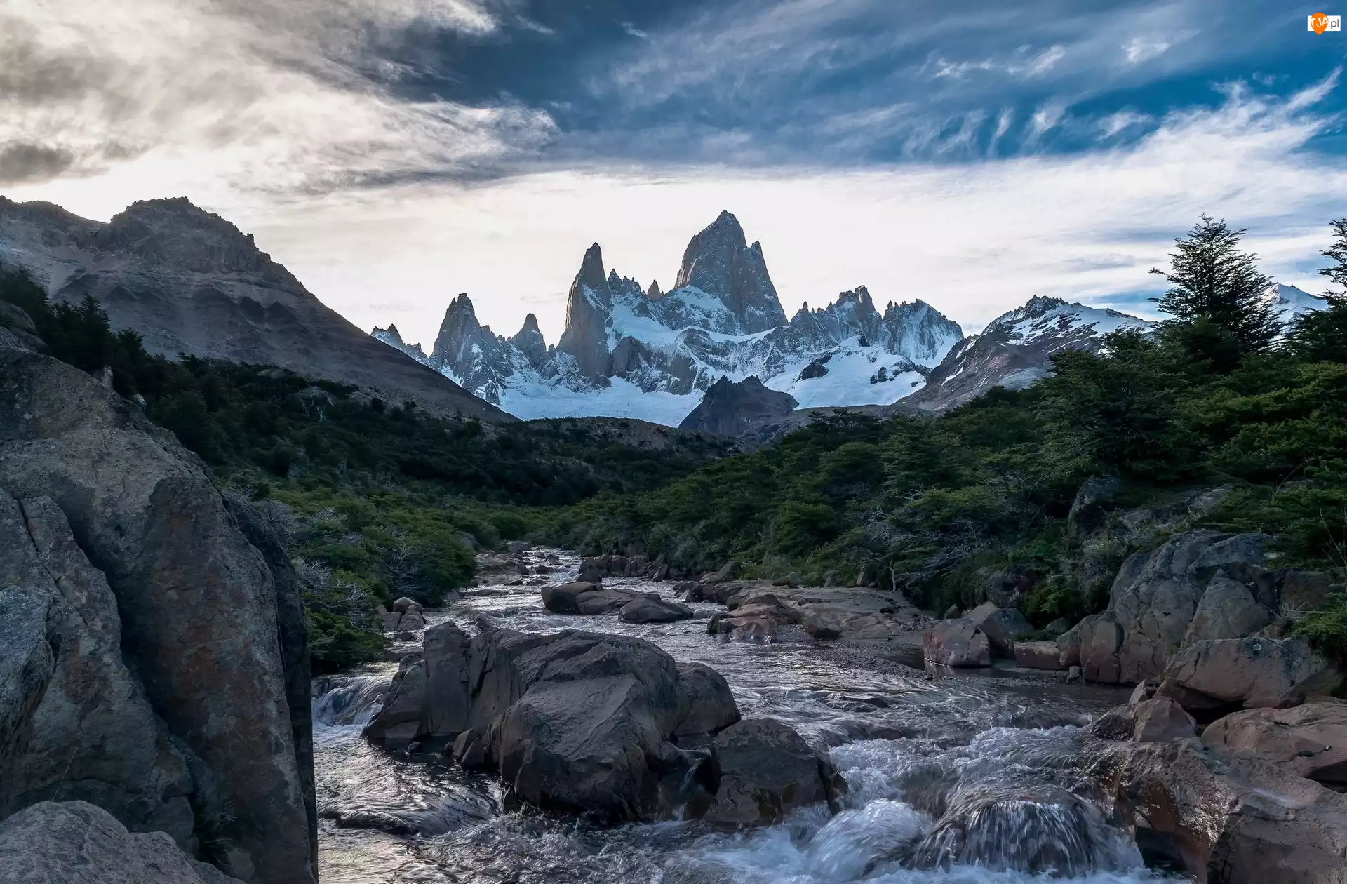 Drzewa, Góry, Strumyk, Szczyt Fitz Roy, Chile, Argentyna, Patagonia, Pogranicze, Góry Andy, Kamienie