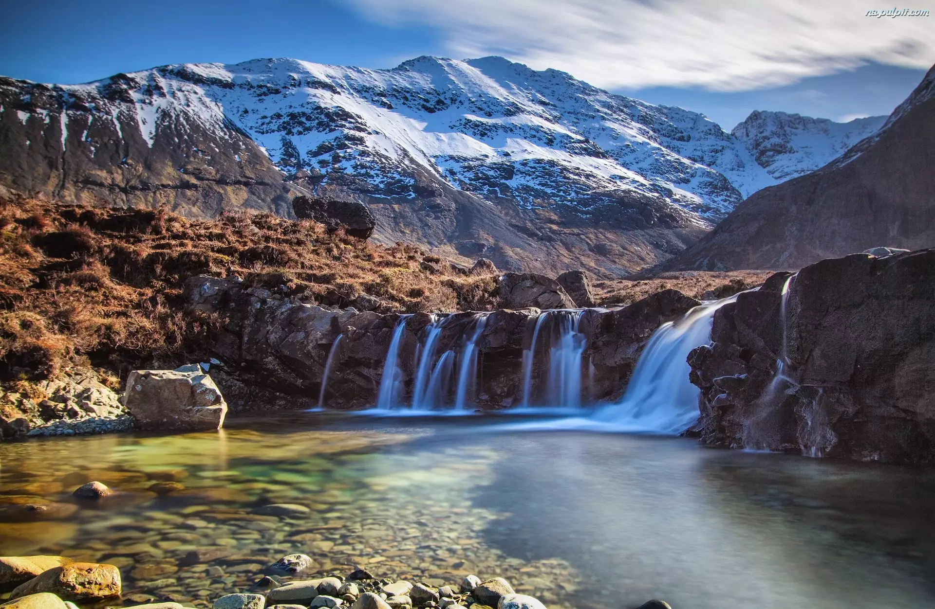 Wodospad, Szkocja, Góry, Jezioro, Wyspa Skye, Zbiorniki Fairy Pools, Kamienie, Glen Brittle