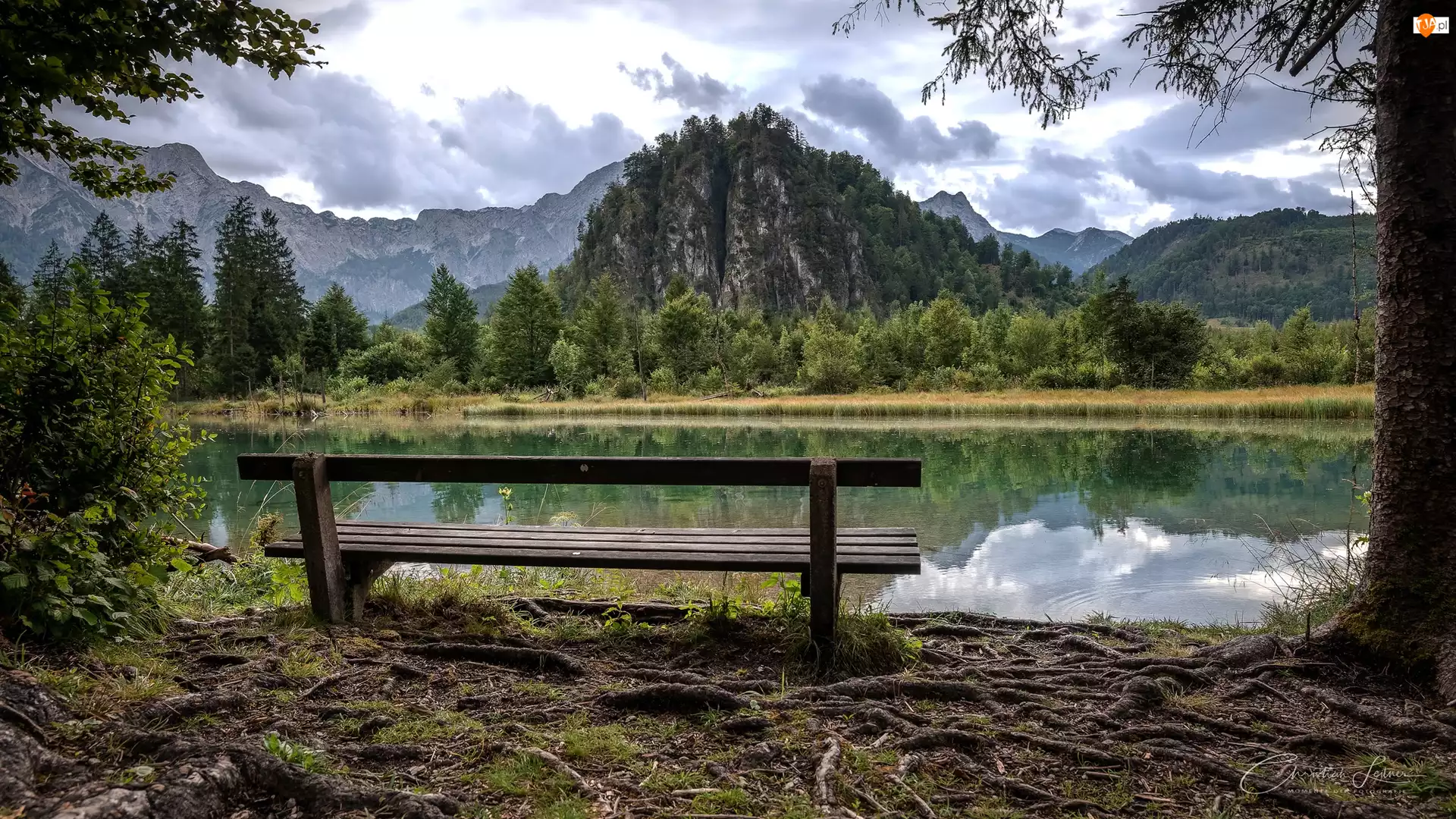 Góry, Austria, Almsee, Drzewa, Jezioro, Ławka