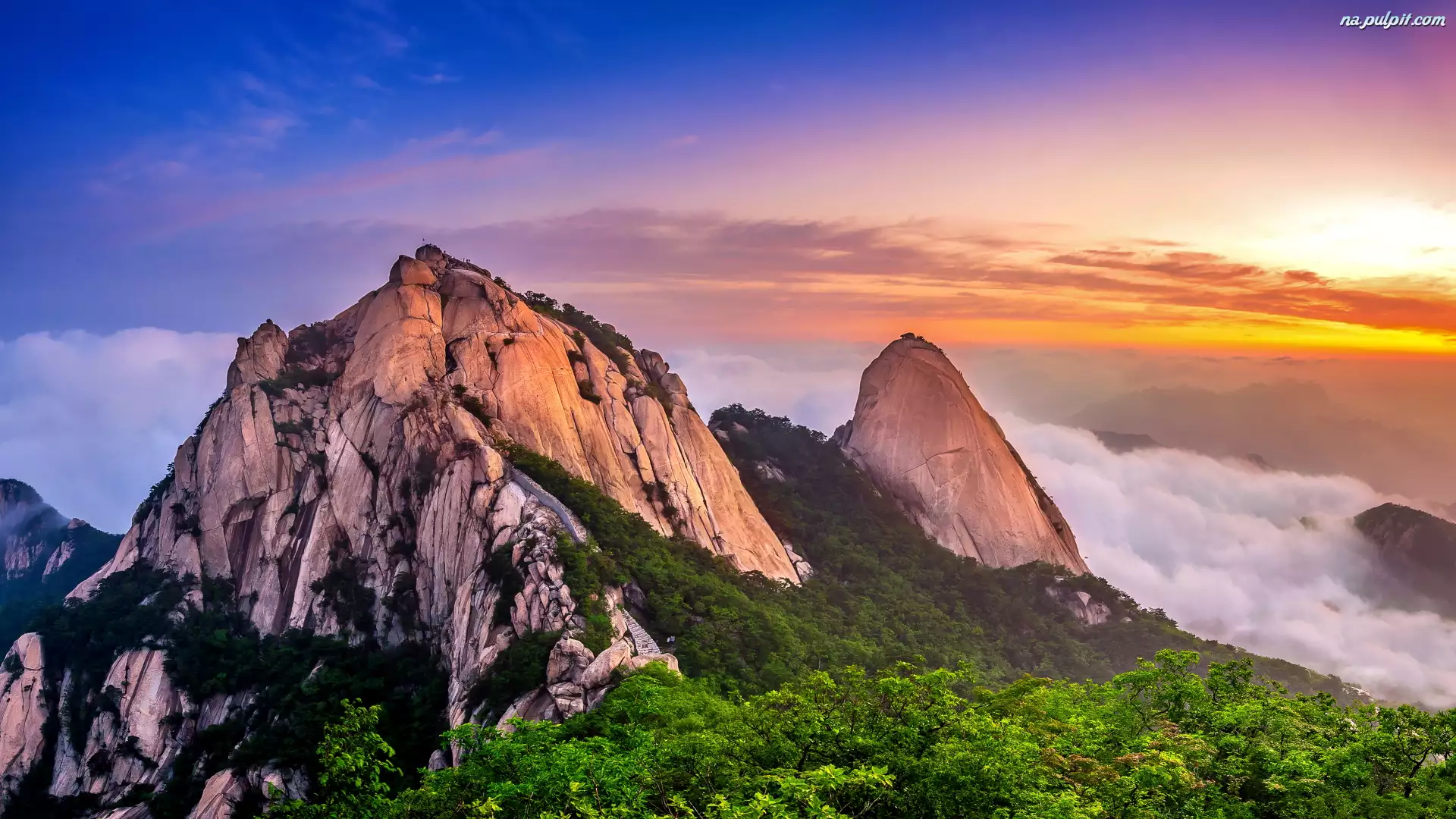Korea Południowa, Góry, Seul, Zielone, Drzewa, Bukhansan, Mgła, Wschód słońca, Lasy