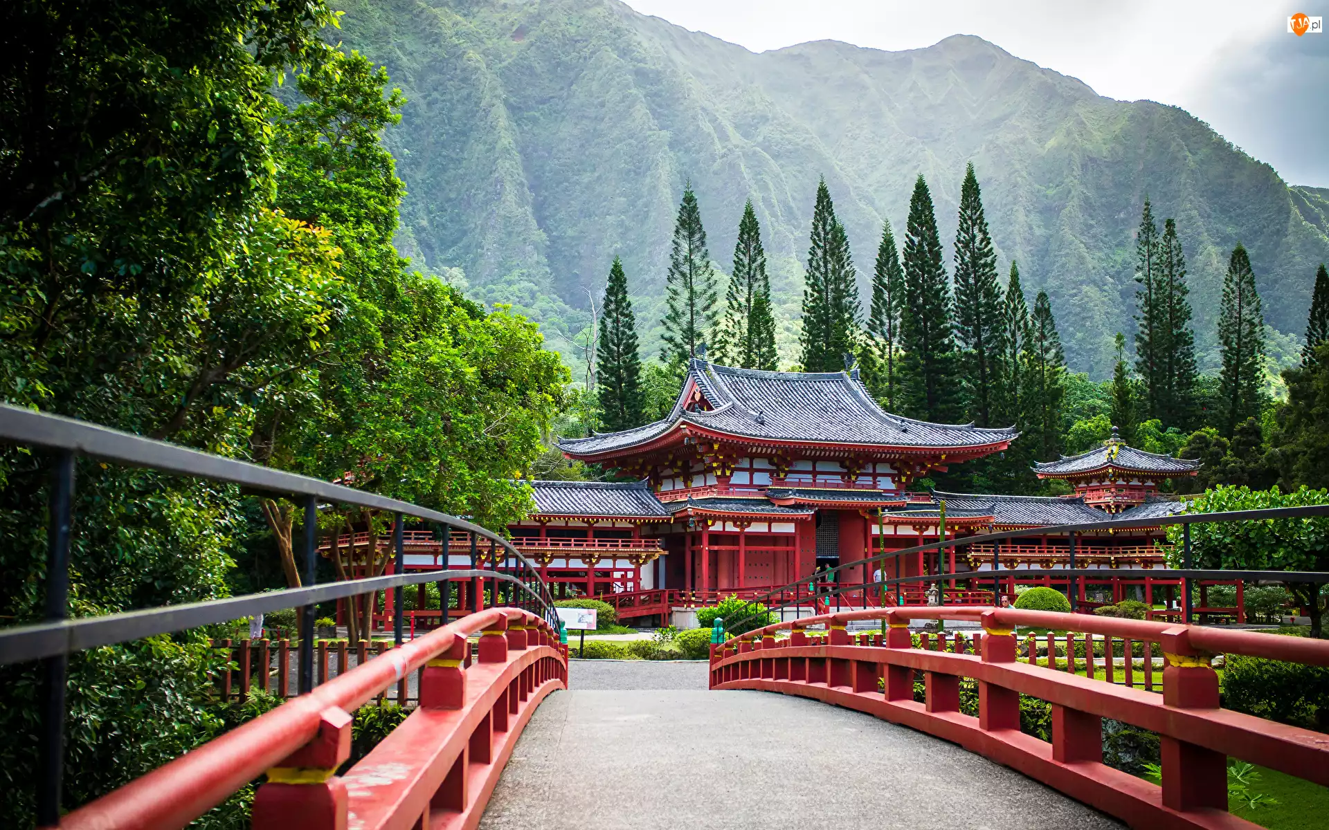 Góry, Byodo-In, Replika, Świątynia, Hawaje, Stany Zjednoczone, Most, Wyspa Oahu, Budowla, Drzewa