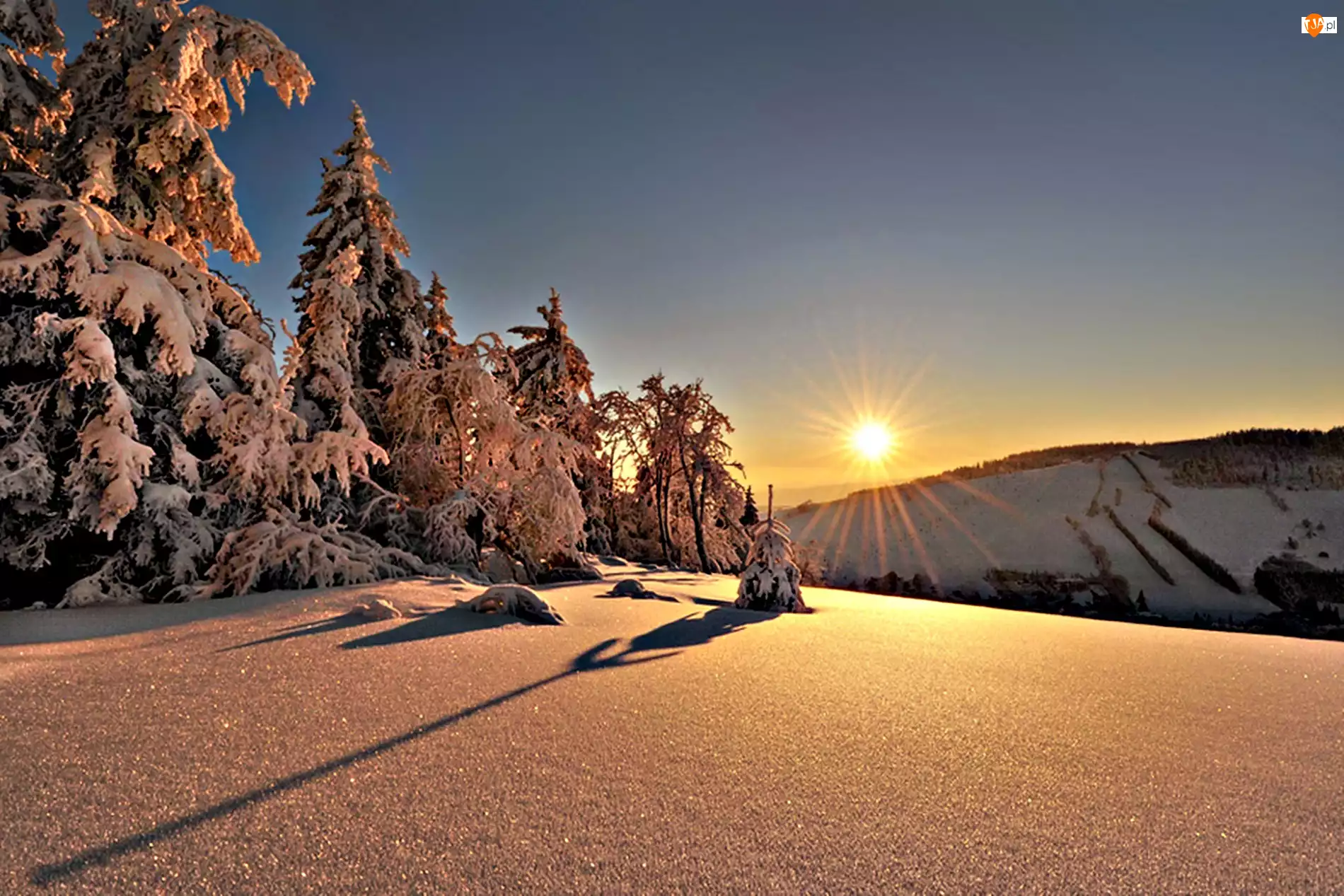 Góry, Choinki, Słońca, Zachód, Śnieg