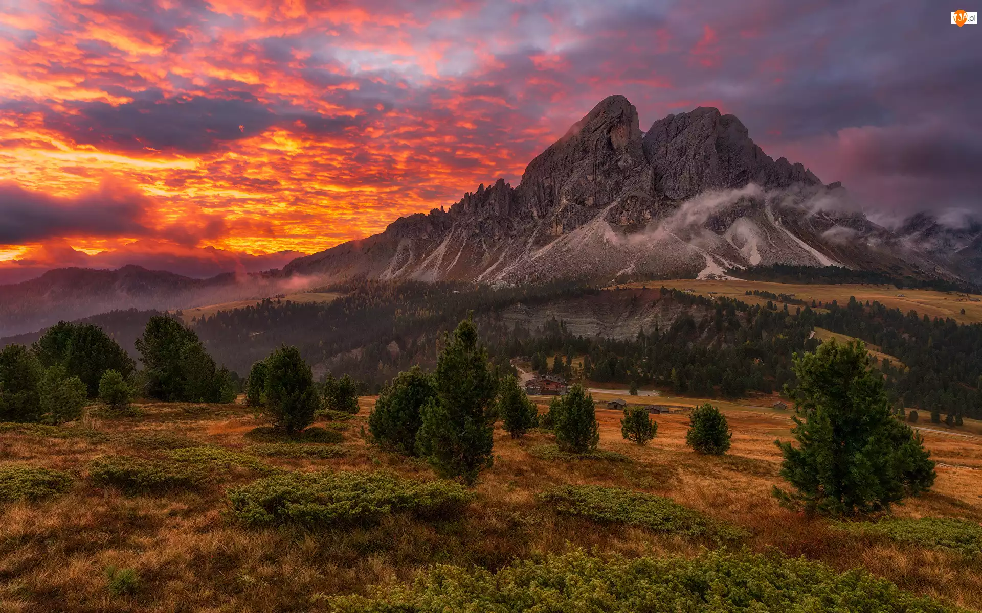 Góry, Dolomity, Chmury, Włochy, Zachód słońca, Roślinność, Drzewa