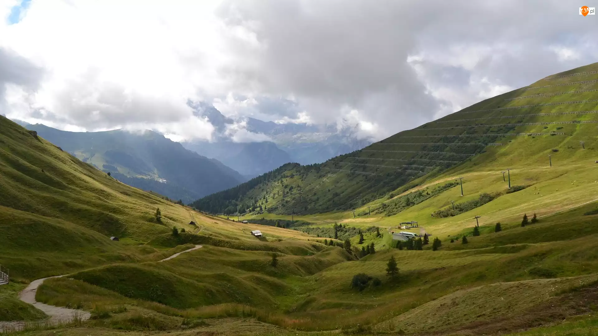 Dolomity, Łąki, Włochy, Drzewa, Prowincja Belluno, Góry