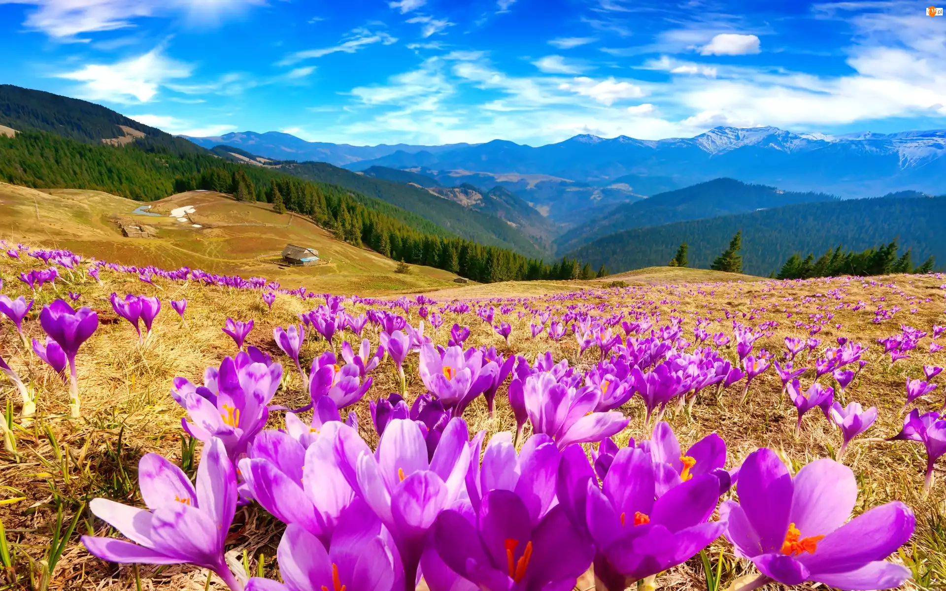 Góry, Domy, Polana, Wiosna, Krokusy, Lasy