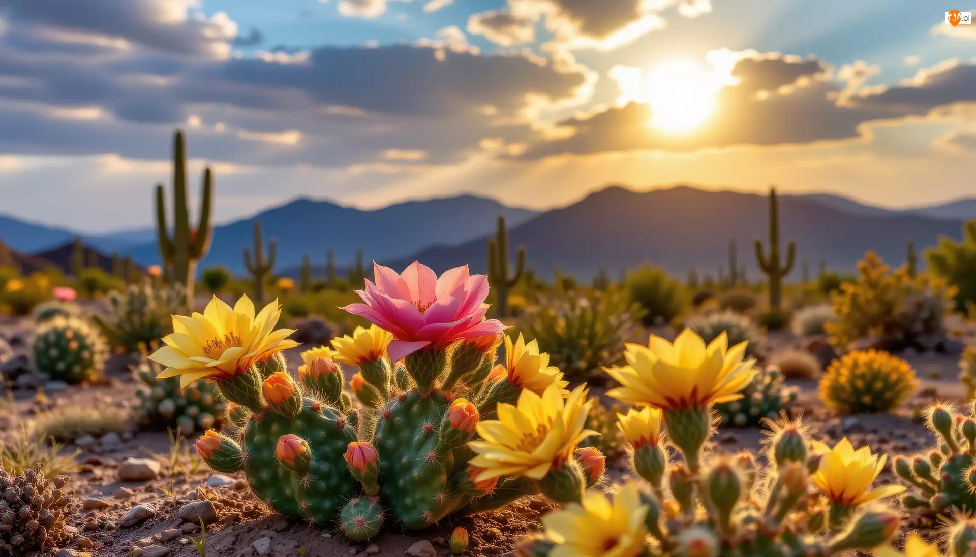 Góry, Grafika AI, Kaktusy, Kwitnące, Niebo