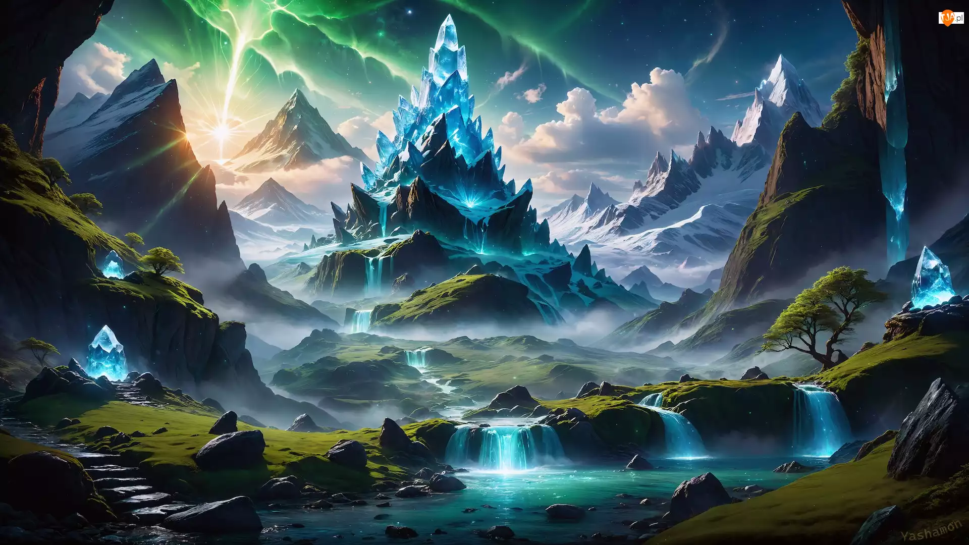 Góry, Grafika, Wodospady, Skały, Rzeka, Schody