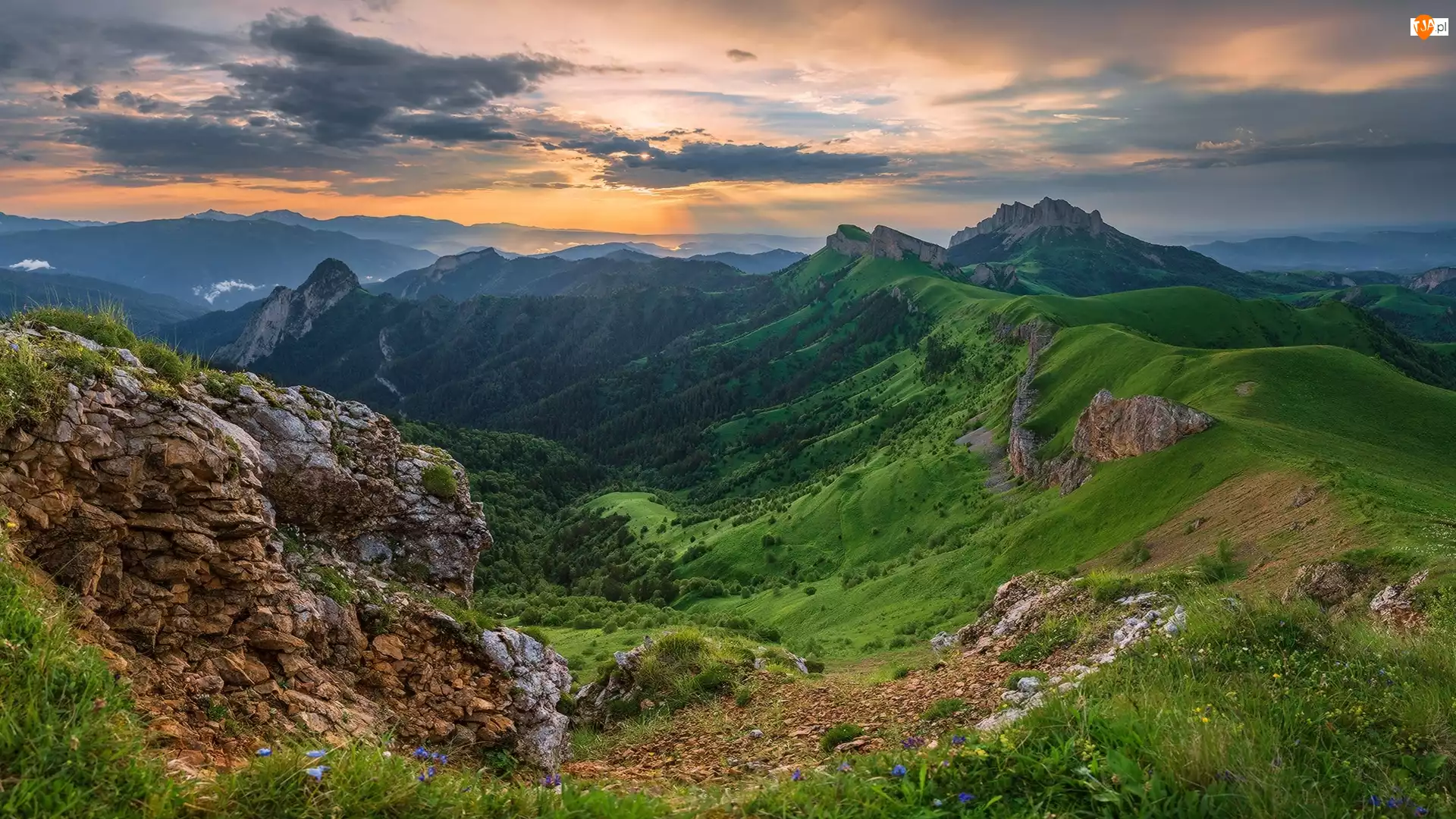 Kaukaz, Dolina, Rosja, Góry, Adygeja, Chmury, Zachód słońca