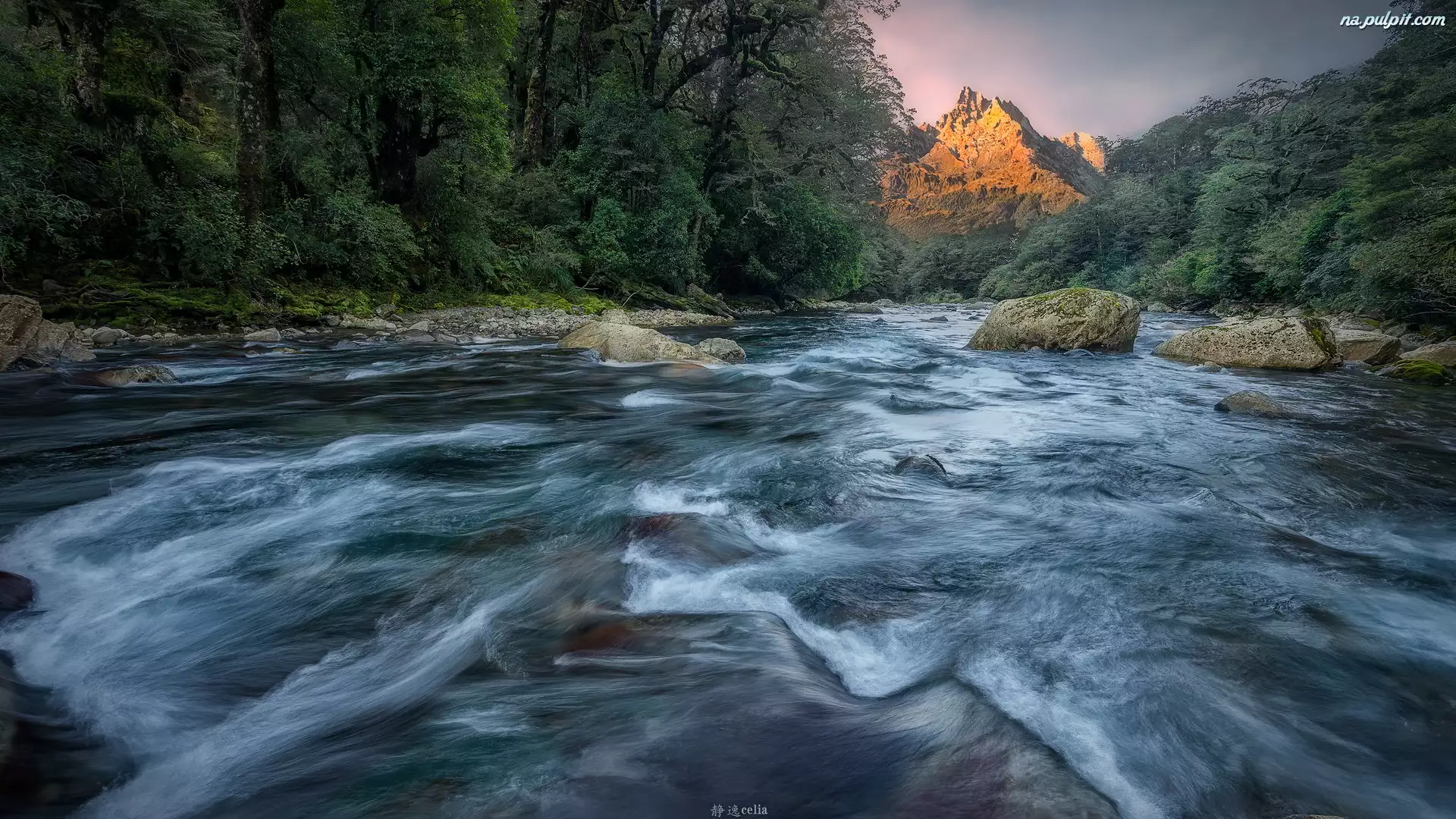 Góry, Rzeka, Las, Park Narodowy Fiordland, Cleddau River, Drzewa, Nowa Zelandia, Kamienie