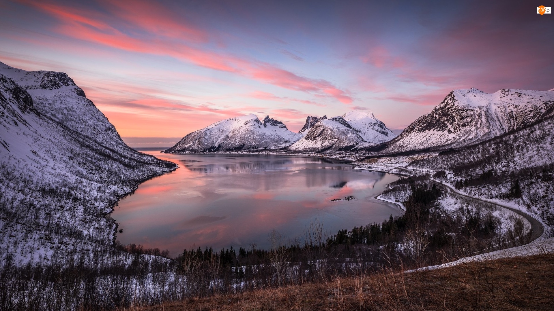 Góry, Morze, Chmury, Zima, Drzewa, Droga, Zatoka