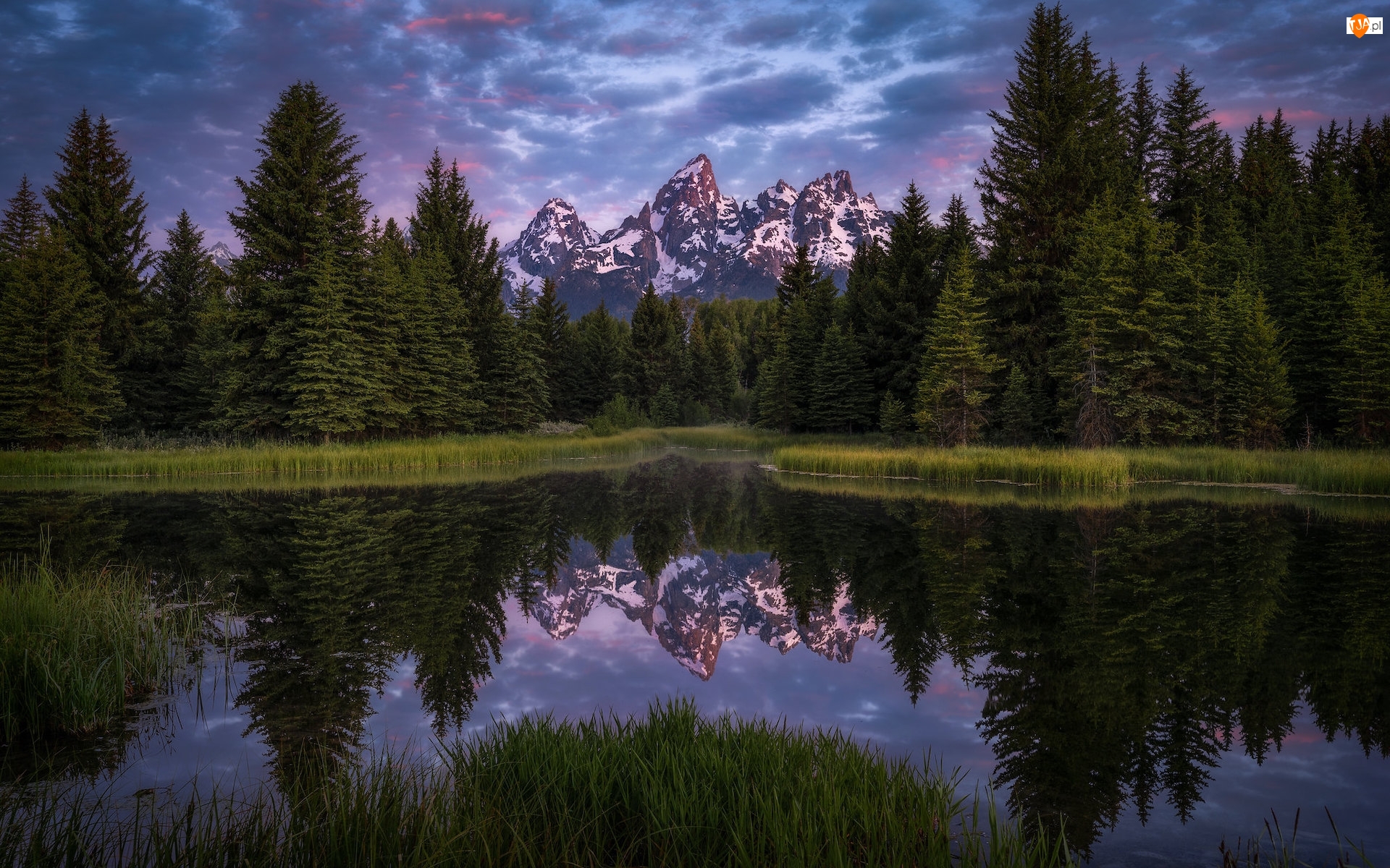 Góry, Rzeka, Drzewa, Snake River, Stan Wyoming, Chmury, Teton Range, Stany Zjednoczone, Las, Park Narodowy Grand Teton, Odbicie