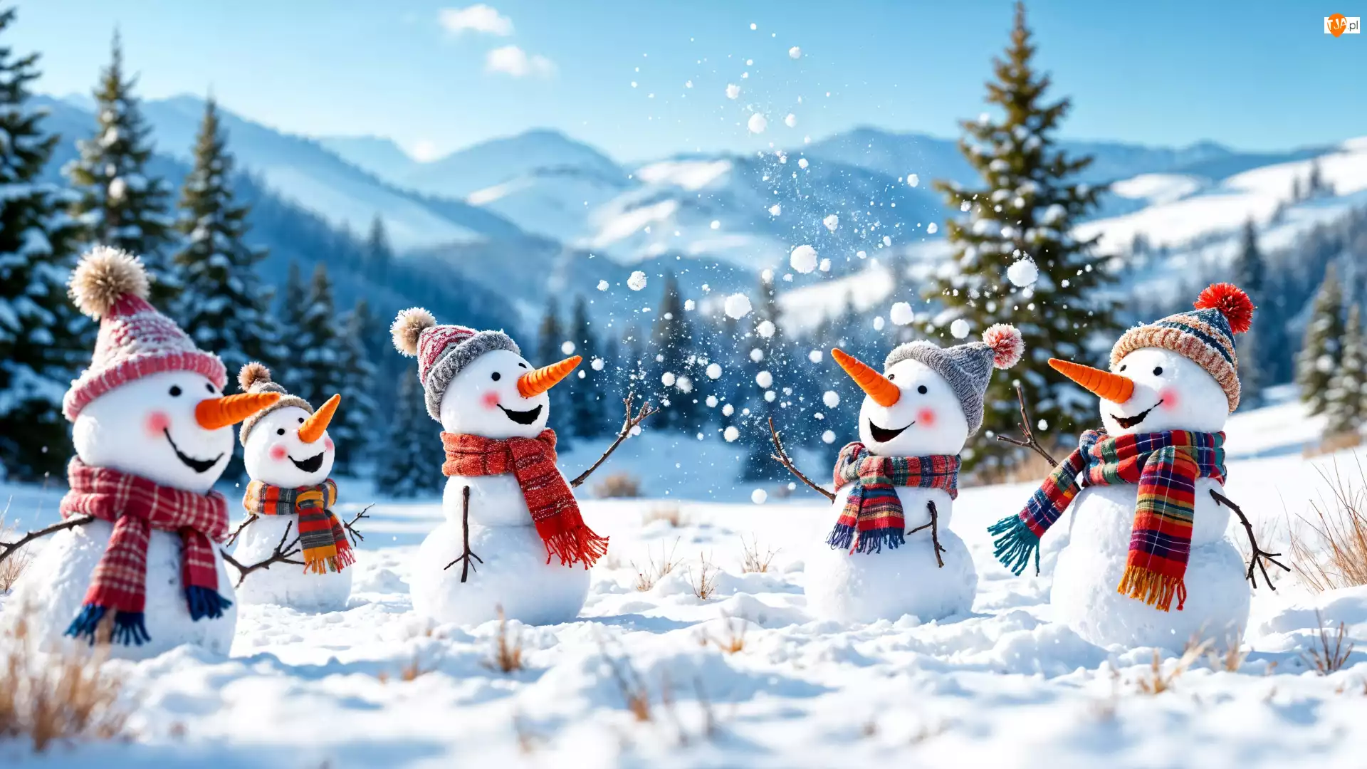 Góry, Śnieg, Bałwanki, Zima, Drzewa