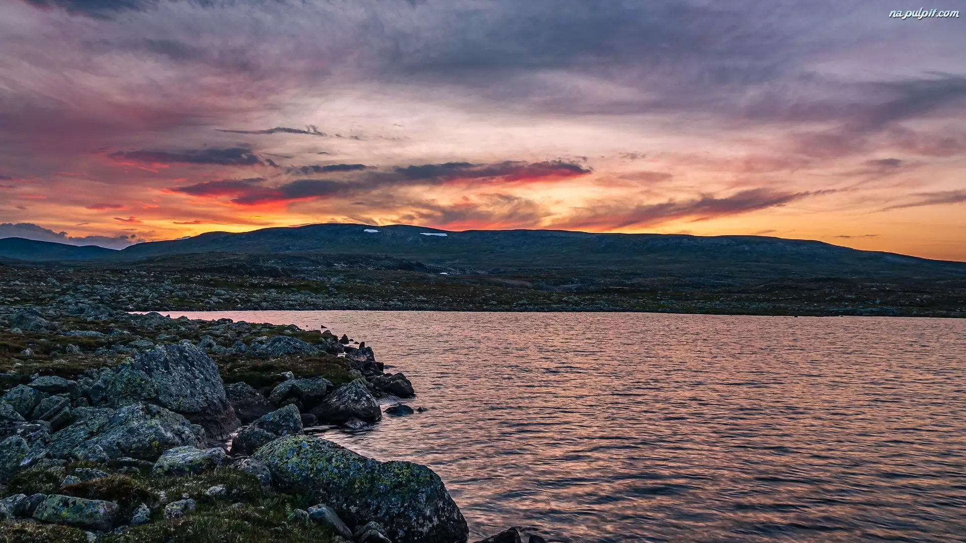 Góry, Wschód słońca, Jezioro, Norwegia, Skały, Płaskowyż Hardangervidda