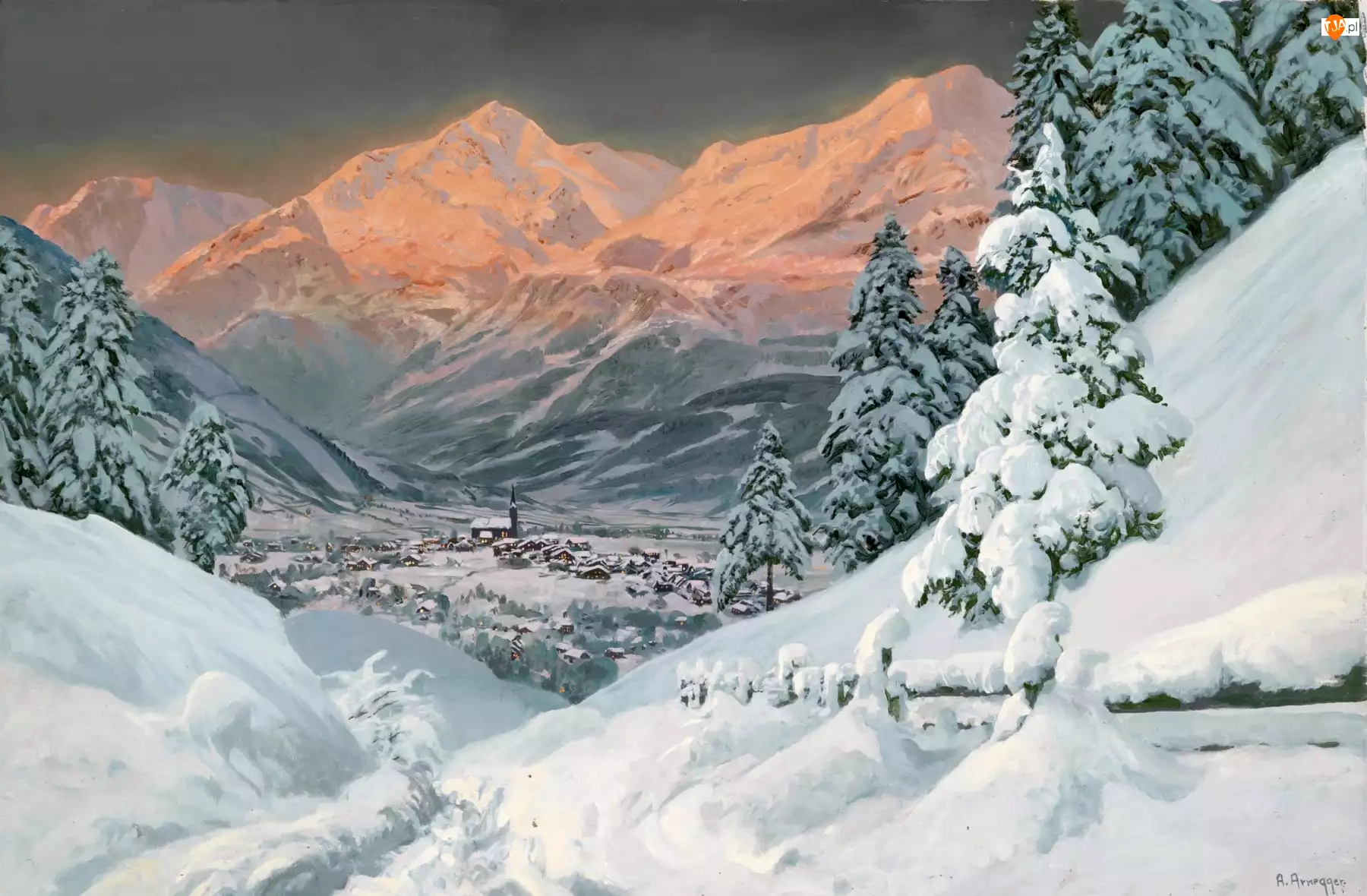 Zimowy, Góry, Zima Malarstwo, Alois Arnegger, Widoczek, Obraz