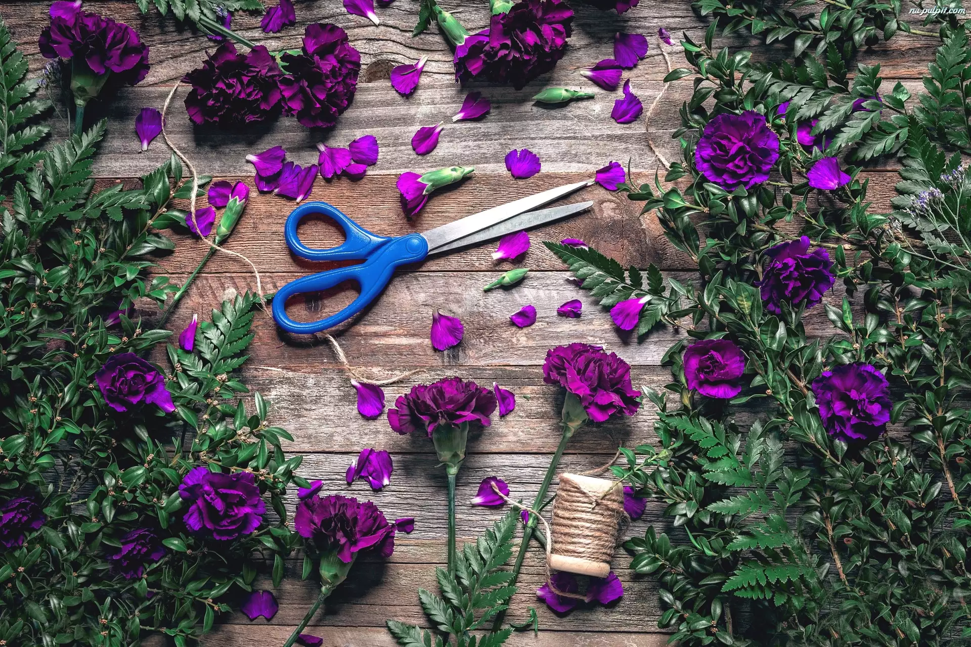 Liście, Paproci, Deski, Goździki, Nożyczki, Sznurek, Szpulka