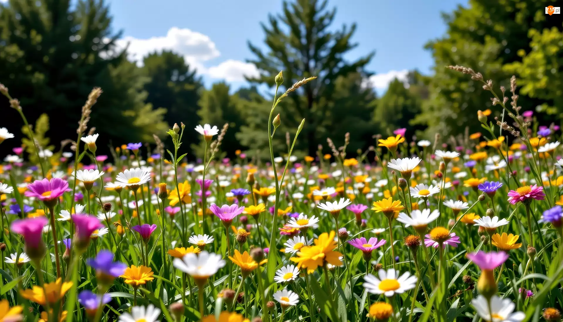 Grafika AI, Łąka, Kwiaty, Drzewa