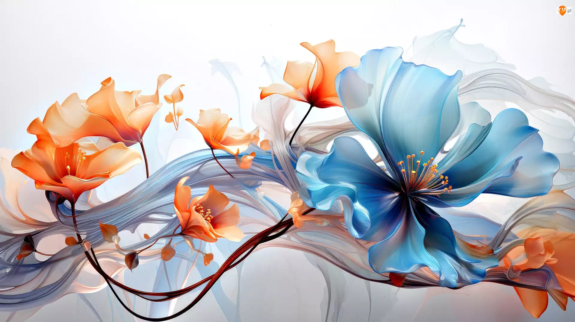 Grafika, Kwiaty, Pomarańczowe, Niebieski