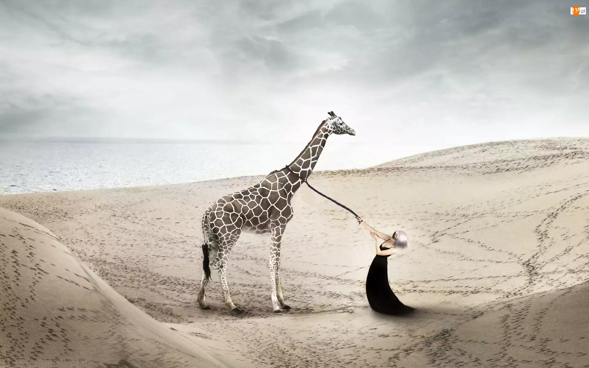 Grafika, Żyrafa, Plaża, Kobieta, Morze