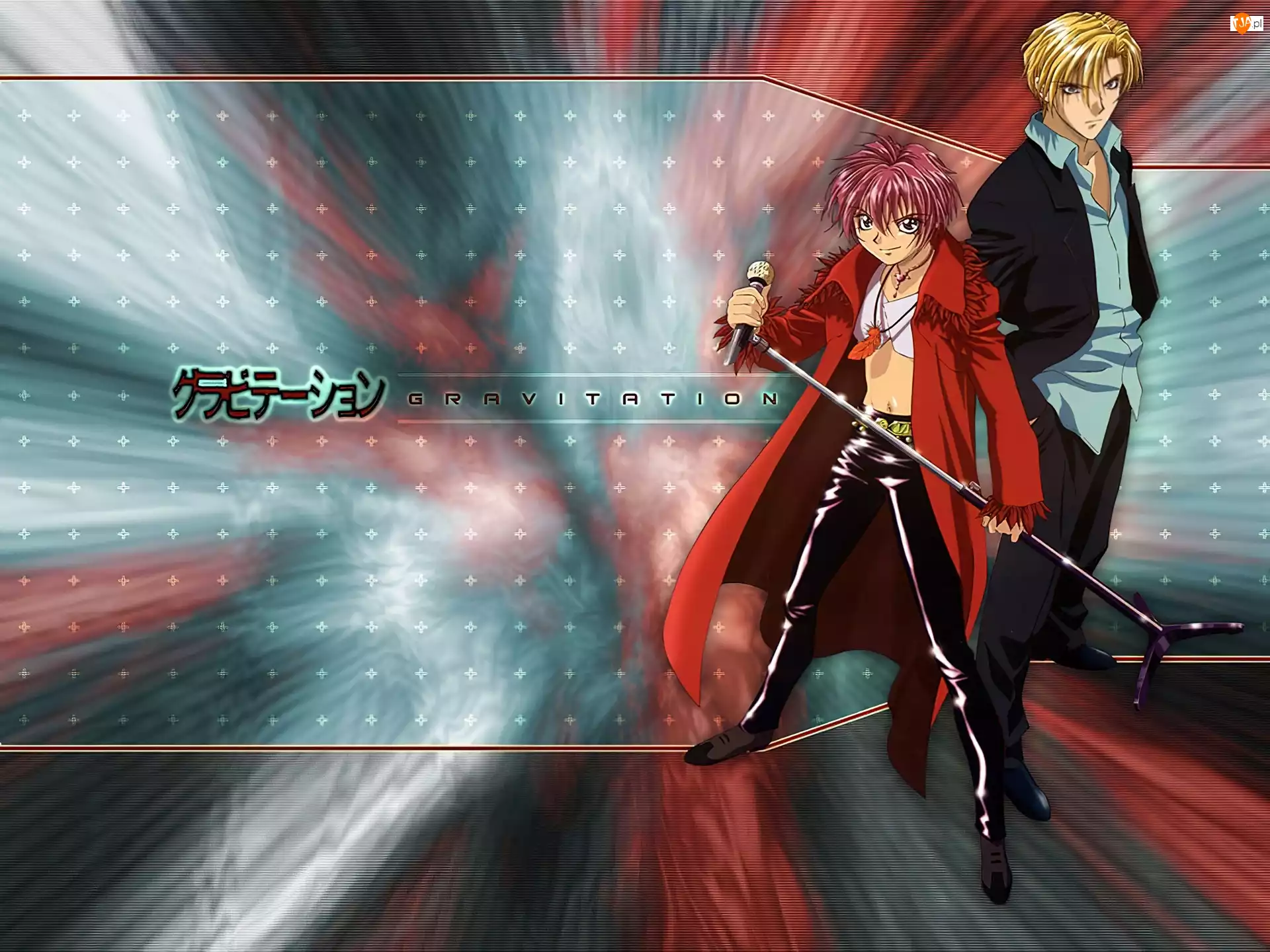 Gravitation, mikrofon, napis, ludzie