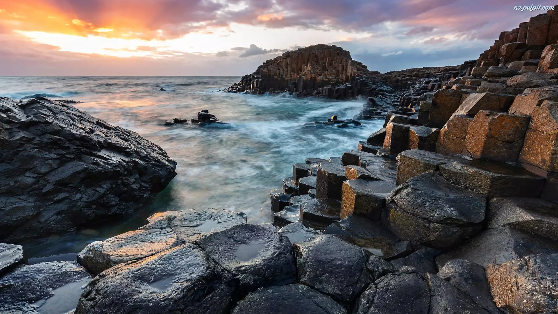 Grobla Olbrzyma, Morze, Chmury, Antrim, Skały, Formacja Giants Causeway, Irlandia Północna, Zachód słońca