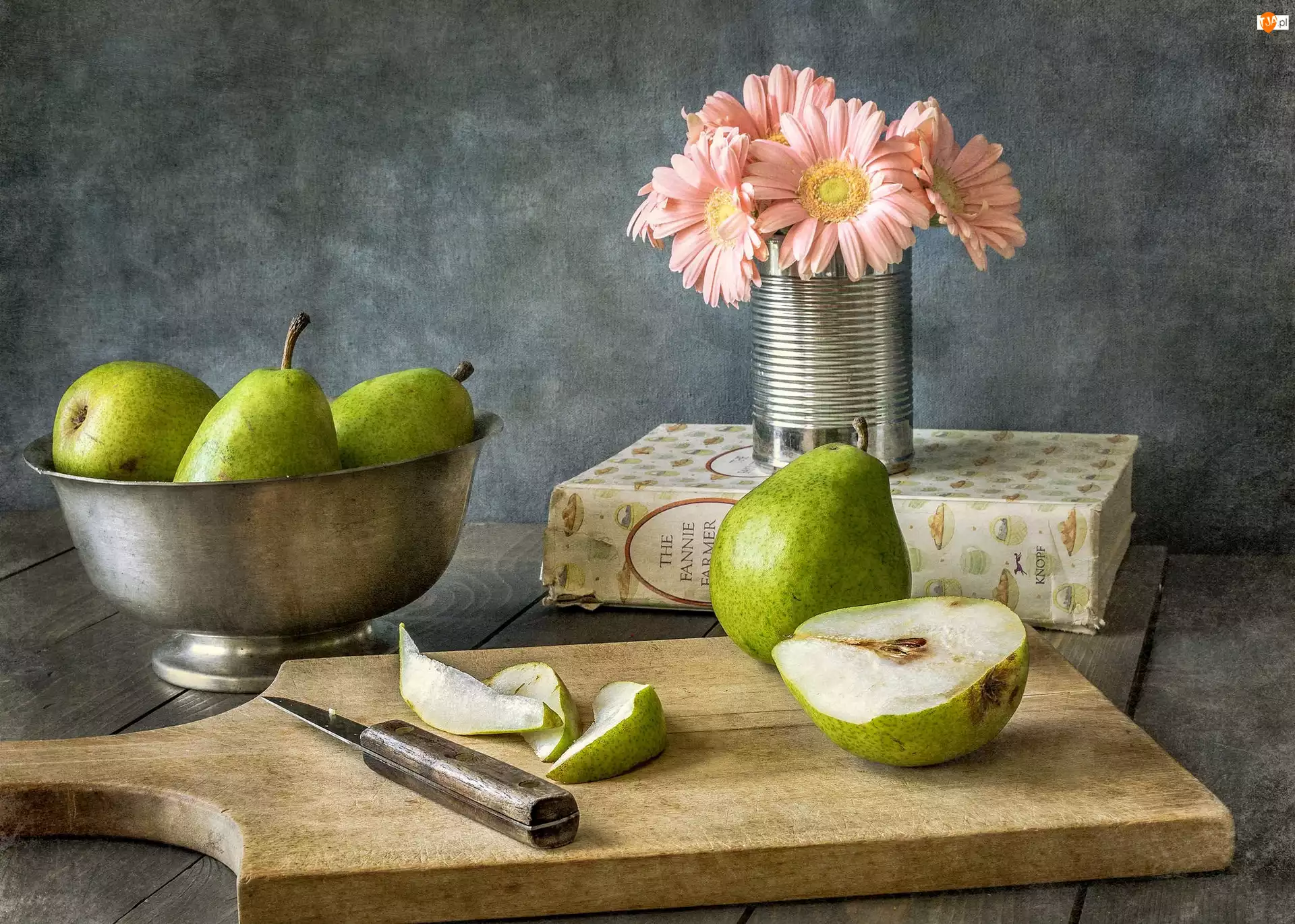 Flakon, Gerbery, Gruszki, Nóż, Książka, Deska
