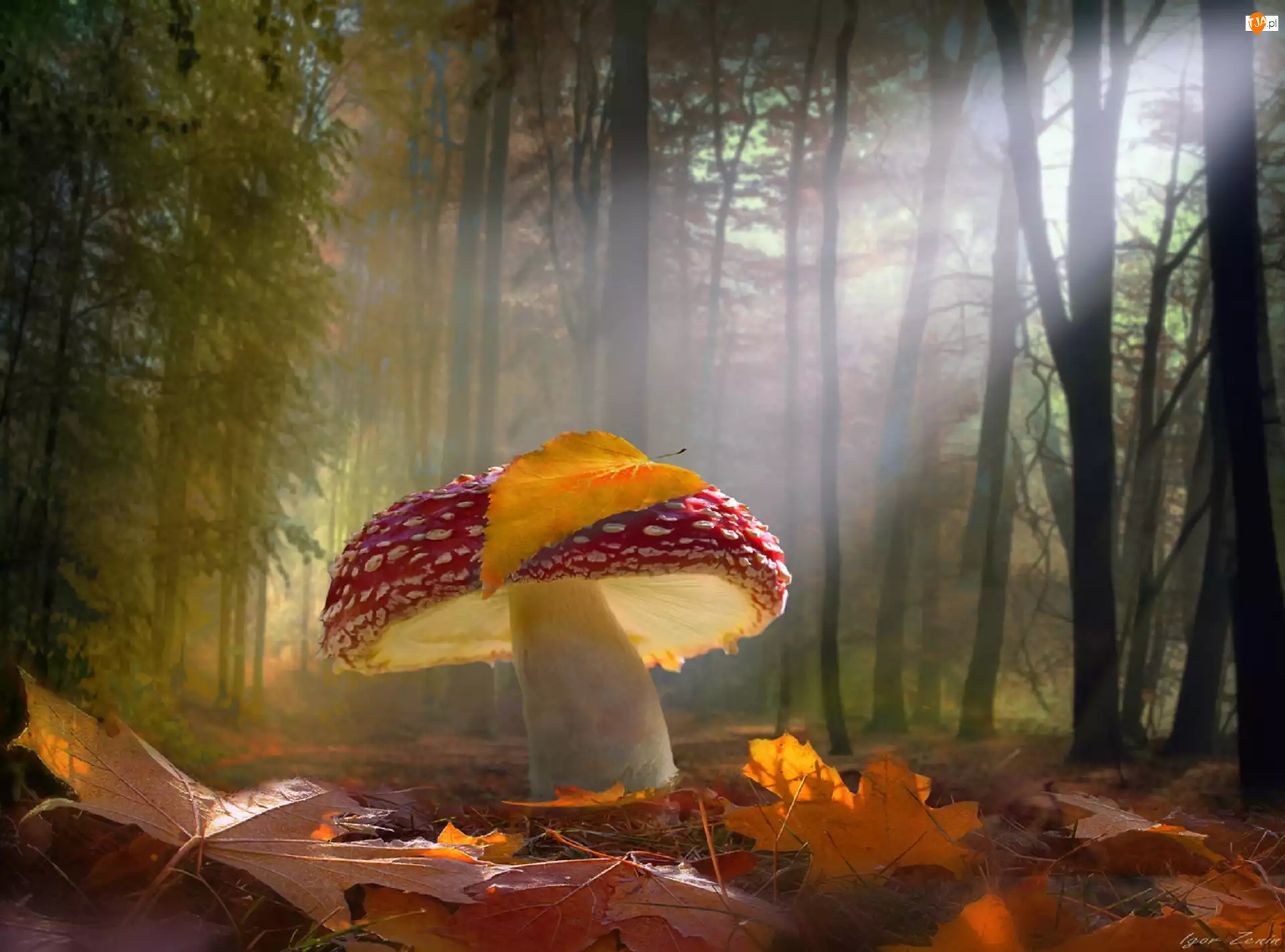 Grzyb, Drzewa, Światło, Przebijające, Muchomor, Las, Liście